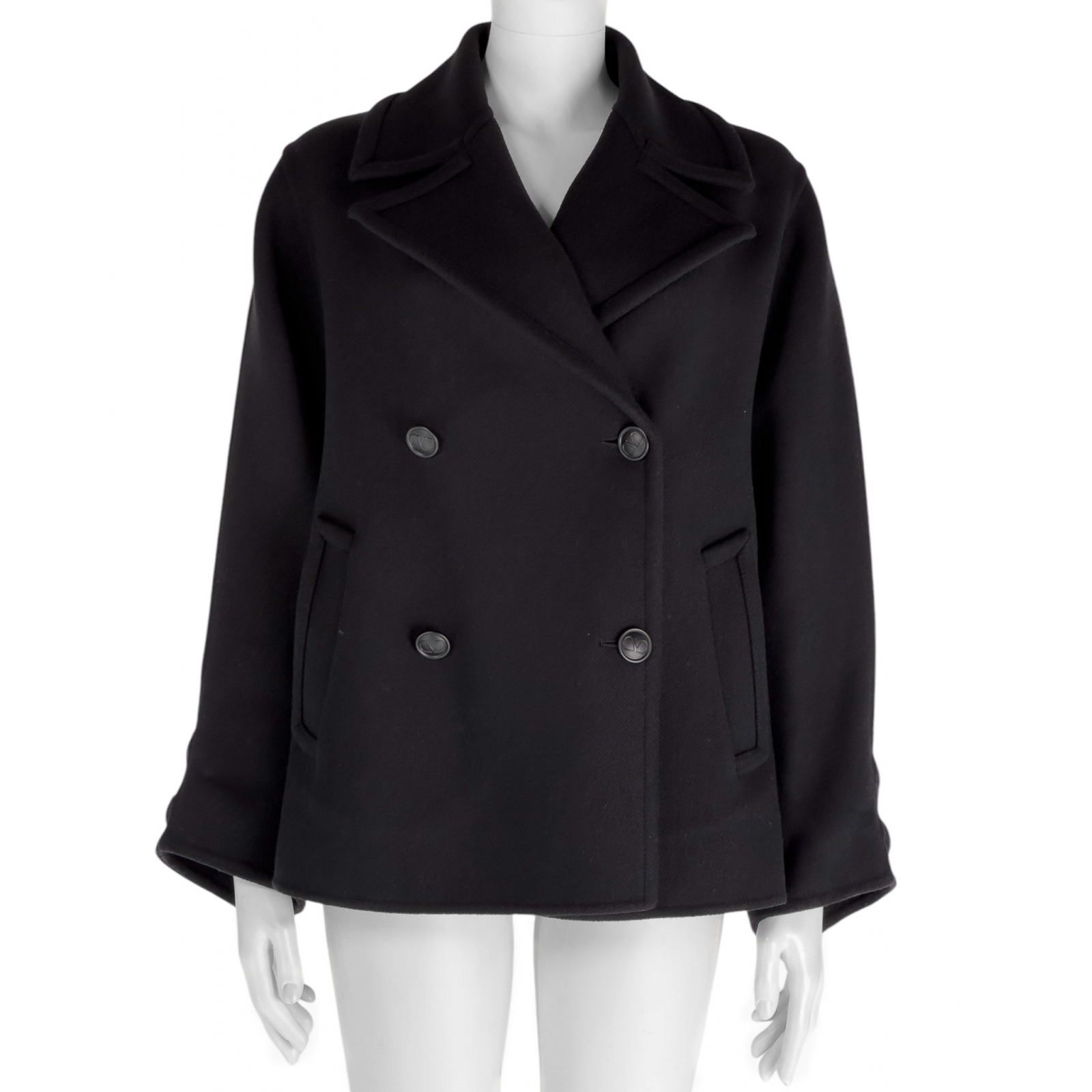 "Czarny wełniany krótki płaszcz, krój oversize, dwurzędowy, zapinany na logowane guziki, dwie kryte kieszenie po bokach, szpiczasty kołnierz, mankiety oraz tył wykończone częściowym paskiem, rozporek, brak podszewki. Rozmiar z metki IT 38. Skład: 77% wełna, 23% poliamid. Wymiary: szerokość mierzona od pachy do pachy 63cm, długość całkowita 66cm."