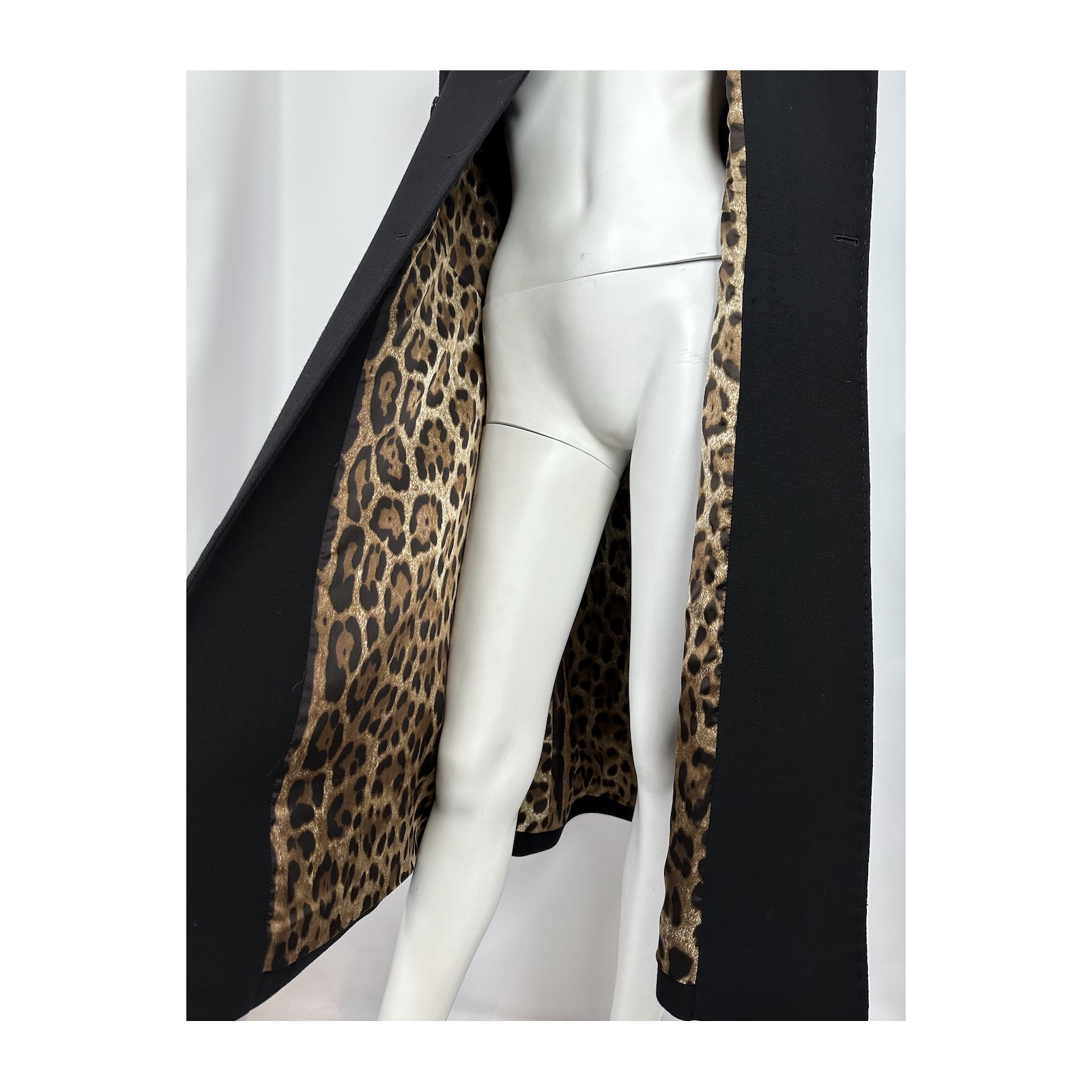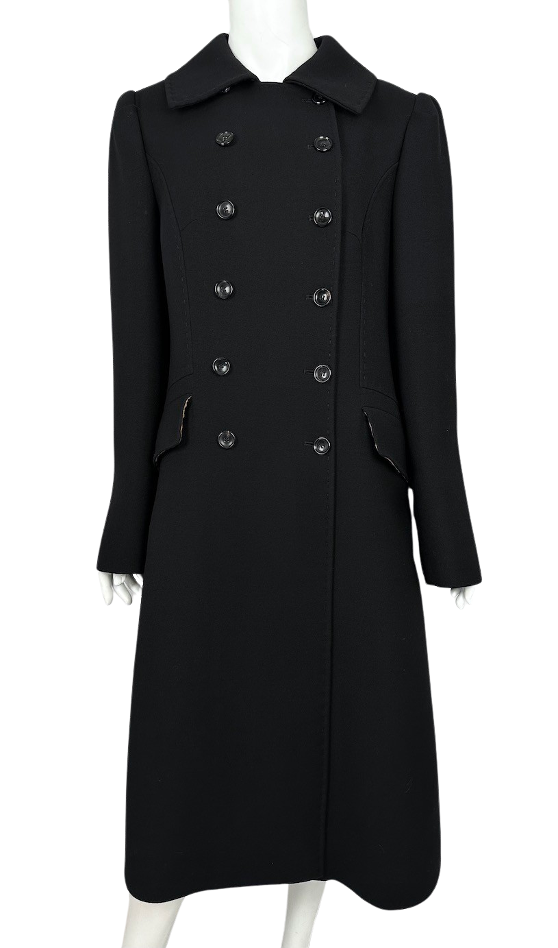 "Czarny dwurzędowy płaszcz, wełniany. Widocznie przeszycia. Podszewka z panterkę. Rozmiar it 48. Skład: 100% wełna, podszewka 97% poliester, 3% elastan. Wymiary: szerokość mierzona od pachy do pachy 51cm, długość rękawa 66cm, długość całkowita 113cm."