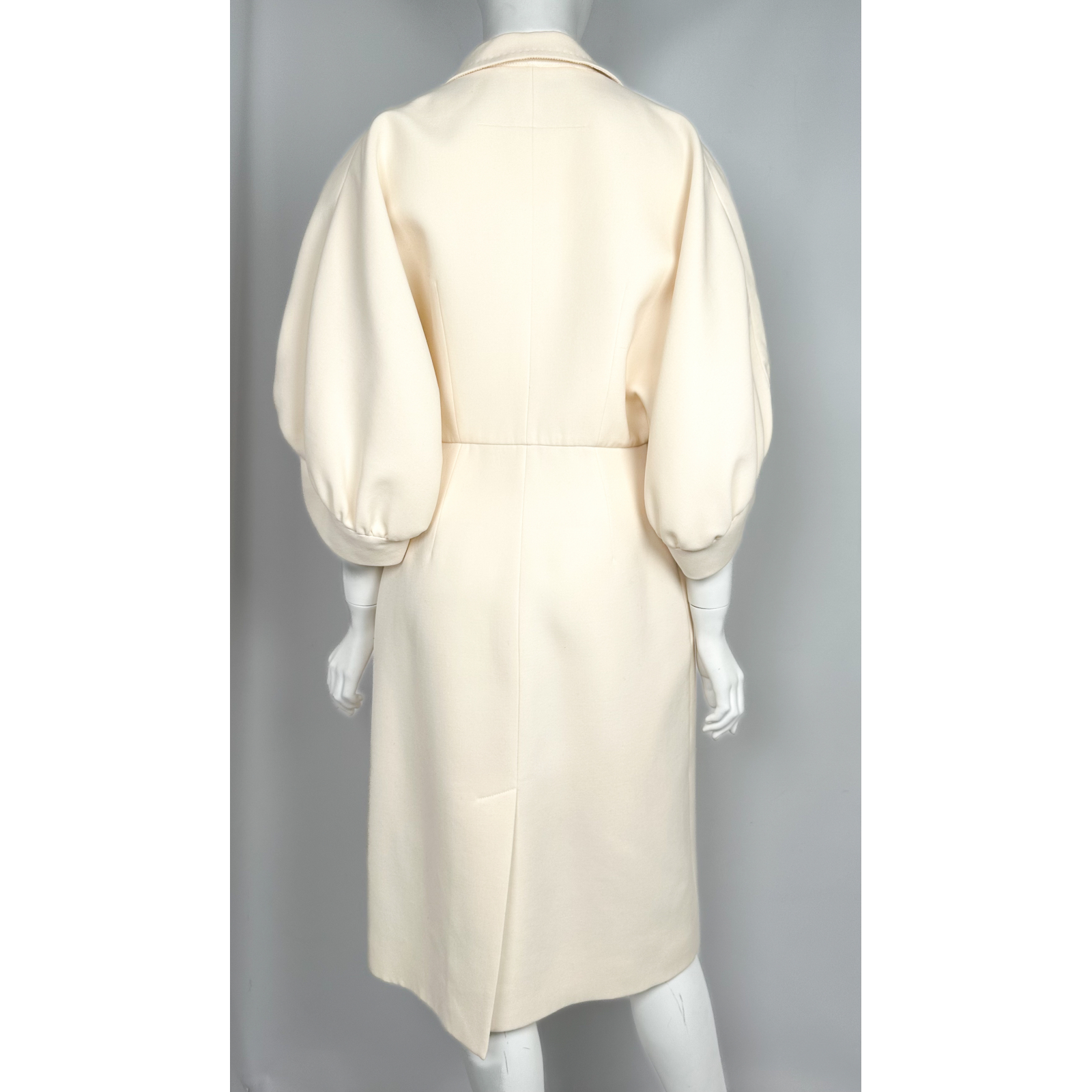 "Kremowy wełniany płaszcz, duże bufiaste krótkie rękawy, kołnierz, dekolt w szpic, taliowany, zapinany na jeden kryty logowany guzik, dwie kieszenie z klapami na przodzie, ozdobiony stębnowaniem, rozporek w tylnej części. Rozmiar z metki IT 38. Skład: 100% wełna; podszewka: 100% wiskoza. Wymiary: szerokość mierzona od pachy do pachy 49cm, długość całkowita 106 cm, szerokość w talii 37cm."