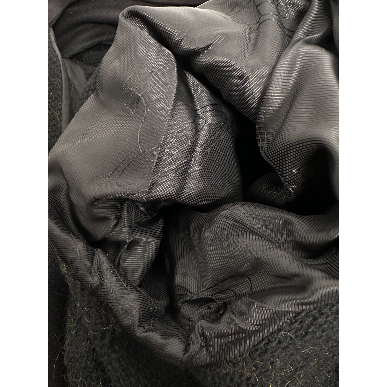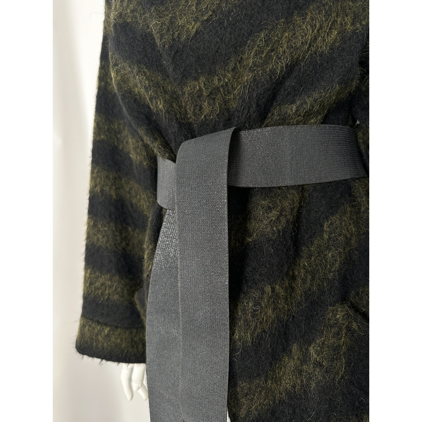 "Czarny krótki wełniany płaszcz w poziome zielone pasy, asymetryczny, szeroki kołnierz, wiązany w pasie paskiem w kolorze szarym, Rozmiar z metki IT 40. Skład: 46% wełna, 35% akryl, 5% alpaka, 5% moher, 5% poliamid, 4% poliester. Wymiary: szerokość mierzona od pachy do pachy 48cm, długość całkowita 75cm."