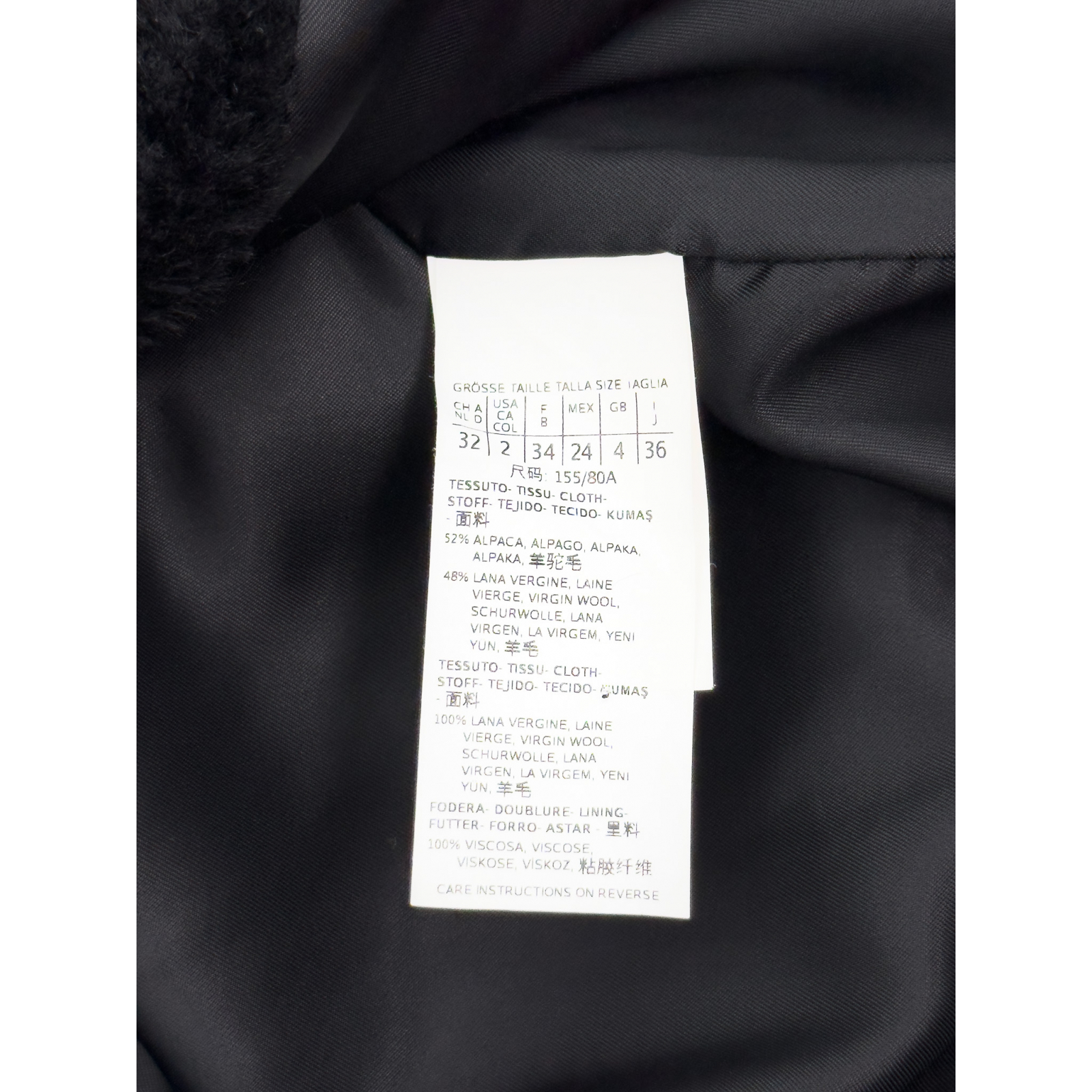 "Czarny wełniany płaszcz z wełny oraz alpaki, krój peleryny, ozdobiony futrzaną wstawką w centralnej części oraz na kołnierzu, dwurzędowy, długość przed kolano, dwie kieszenie po bokach. Rozmiar z metki IT 36. Skład: 52% alpaka, 48%; podszewka : 100% wiskoza. Wymiary: szerokość mierzona od pacy do pachy 67cm, długość całkowita 76cm."