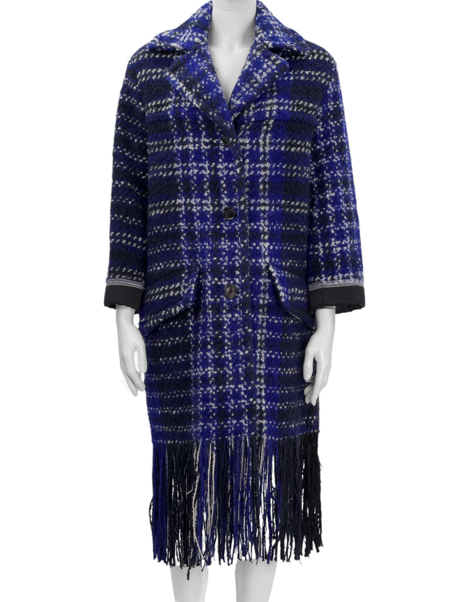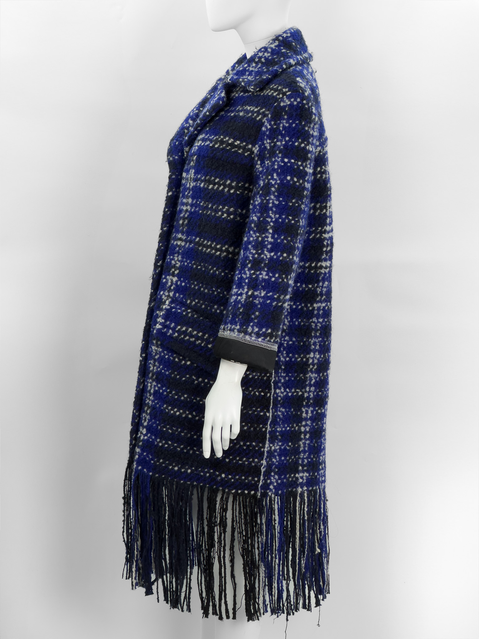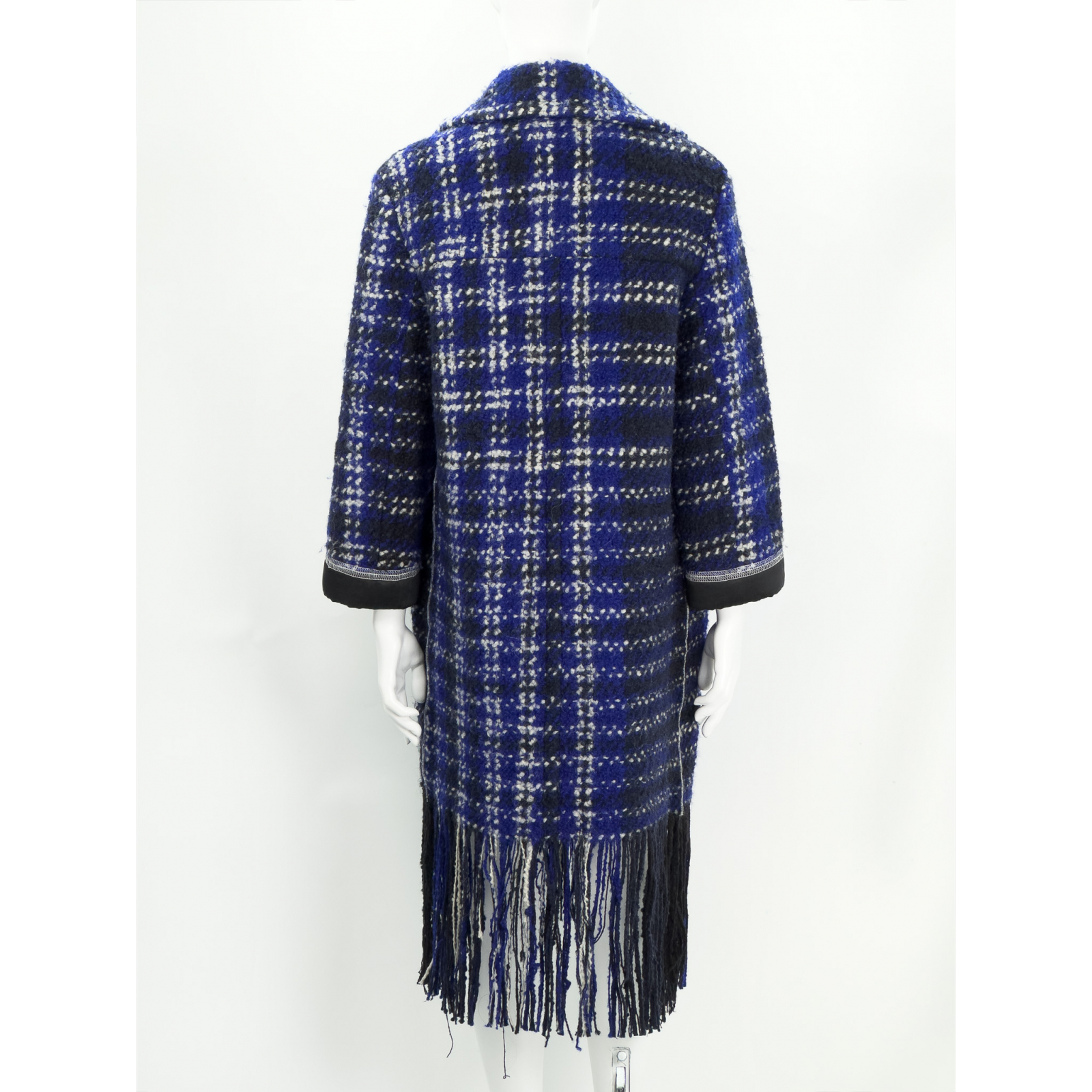"Kobaltowy wełniany płaszcz ozdobiony biało-granatowo-czarnym wzorem, wykończony długimi frędzlami, długość midi, jednorzędowy, zapinany na trzy brązowe guziki, dwie duże kieszenie z klapami po bokach, kołnierz, czarne satynowe mankiety oraz podszewka. Rozmiar z metki IT 40. Skład: 92% wełna dziewicza, 8% nylon; podszewka: 100% wiskoza. Wymiary: szerokość mierzona od pachy do pachy 55cm, długość całkowita 115cm."