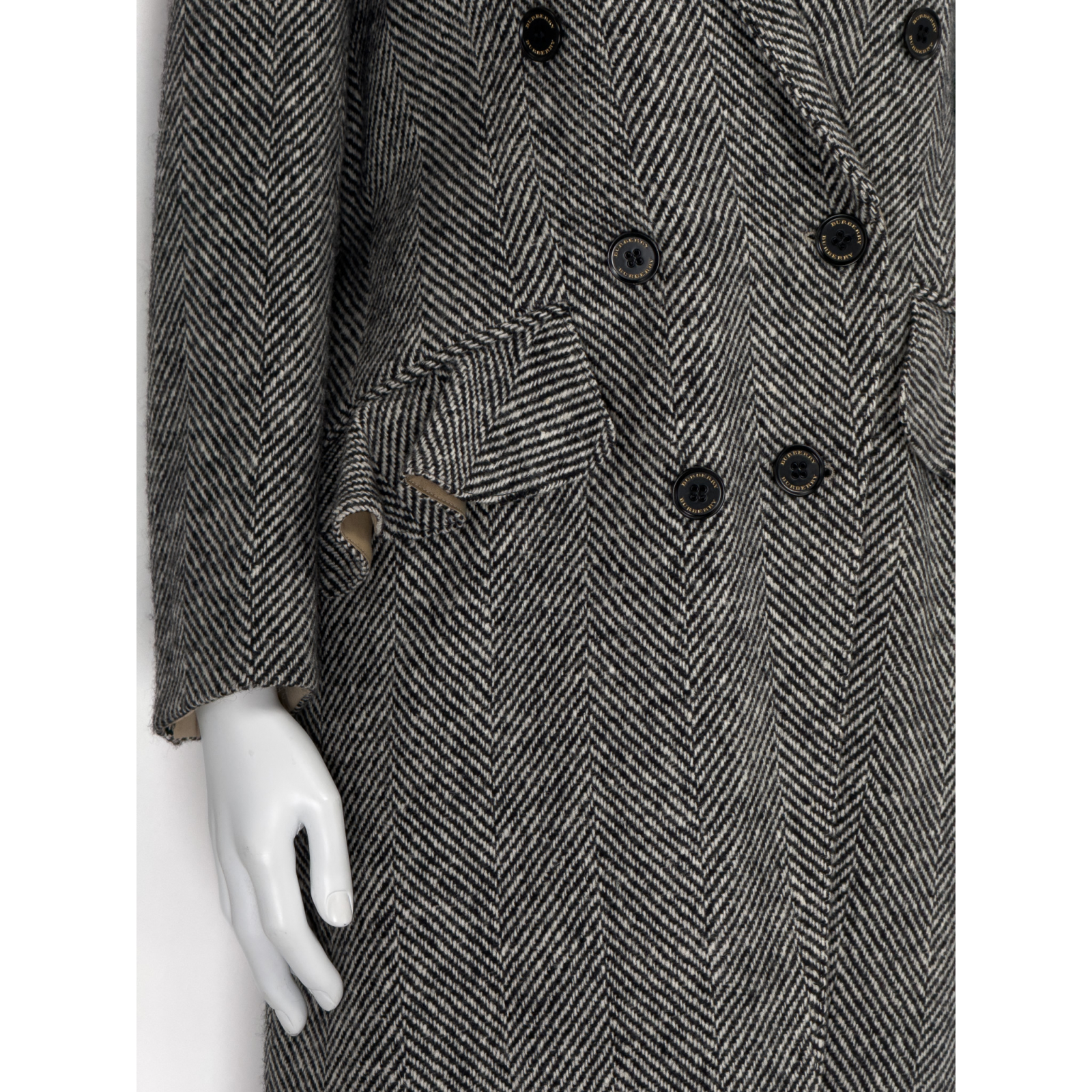 "Czarno-biały wełniany płaszcz w jodełkę, długość do połowy łydki, dwurzędowy, zapinany na czarne guziki ozdobione złotym logo, dekolt w szpic, poduszki na ramionach, taliowany, dwie kryte kieszenie po bokach wykończone klapami w kształcie falban, rozporek, częściowy pasek w tylnej części, logowana czarna podszewka. Rozmiar z metki IT 40. Skład: 100% wełna; podszewka: 50% wiskoza, 50% acetat; podszewka na rękawach: 100% wiskoza. Wymiary: szerokość mierzona od pachy do pachy 45cm, długość całkowita 112cm."