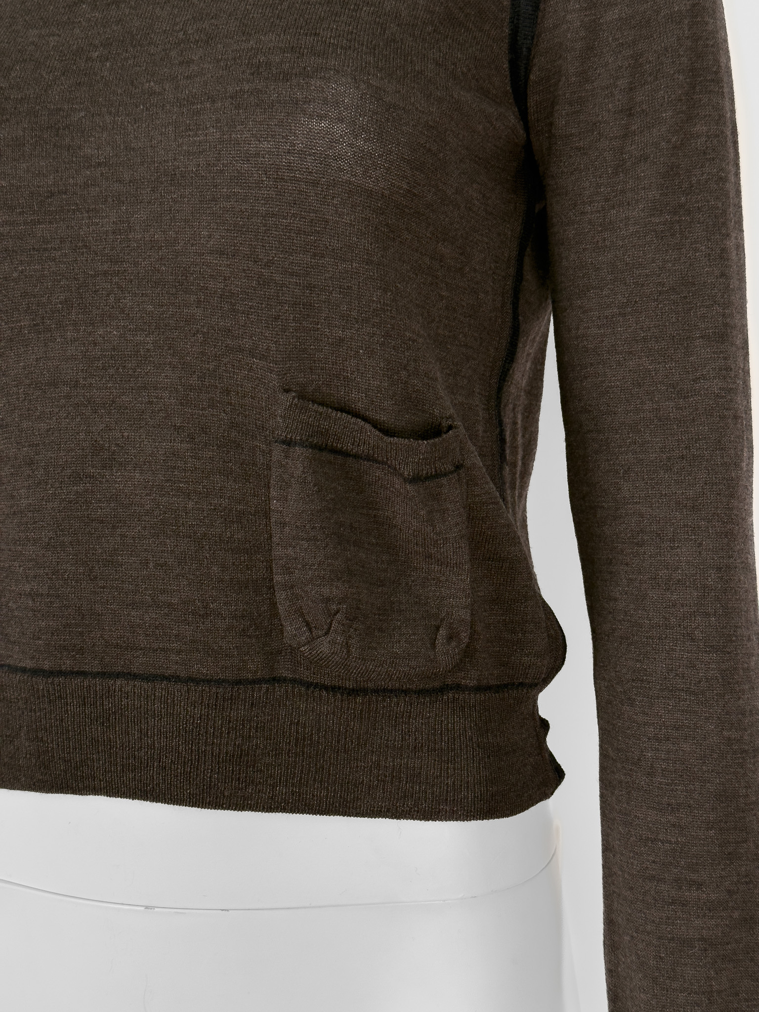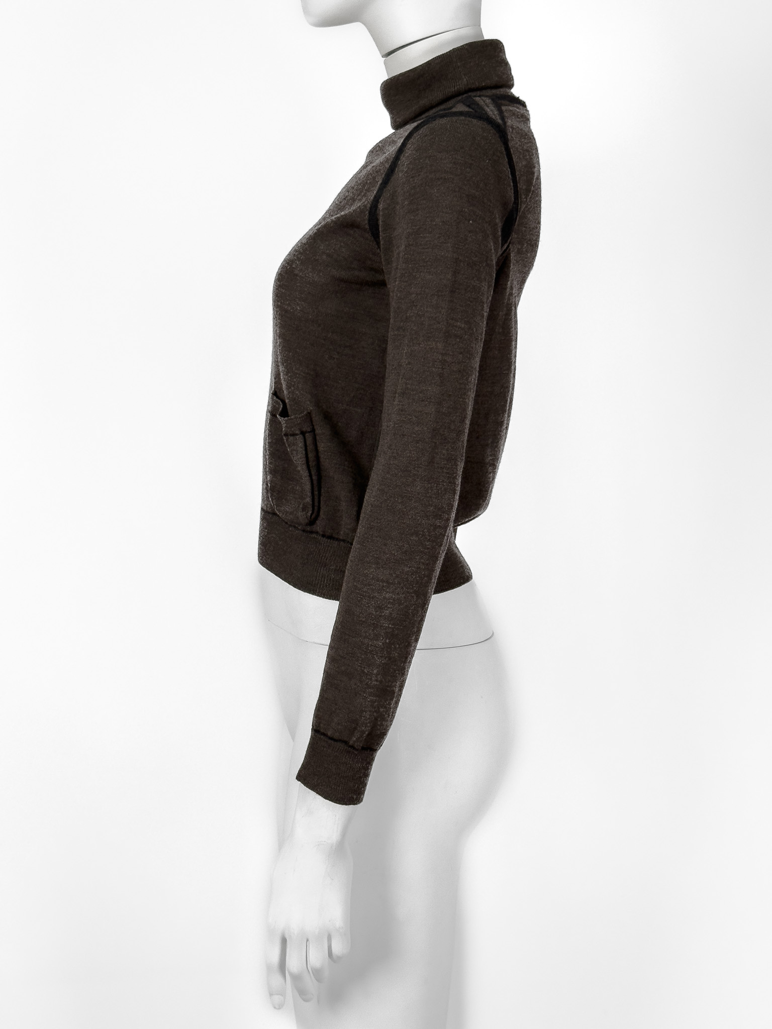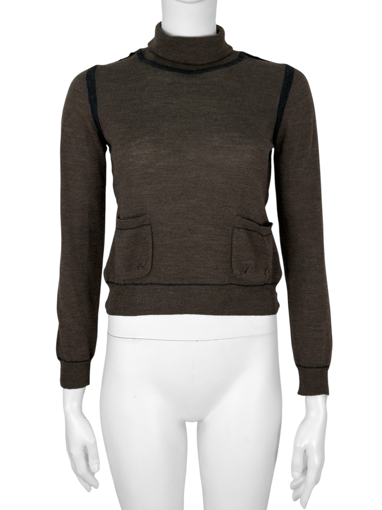 "Brązowy wełniany sweter z golfem ozdobiony czarną lamówką, dopasowany krój, wykończony ściągaczem, dwie kieszonki w dolnej części. Stan bardzo dobry. Rozmiar z metki S. Skład: 100% wełna merynosa. Wymiary: szerokość mierzona od pachy do pachy 46cm, długość całkowita 49cm."