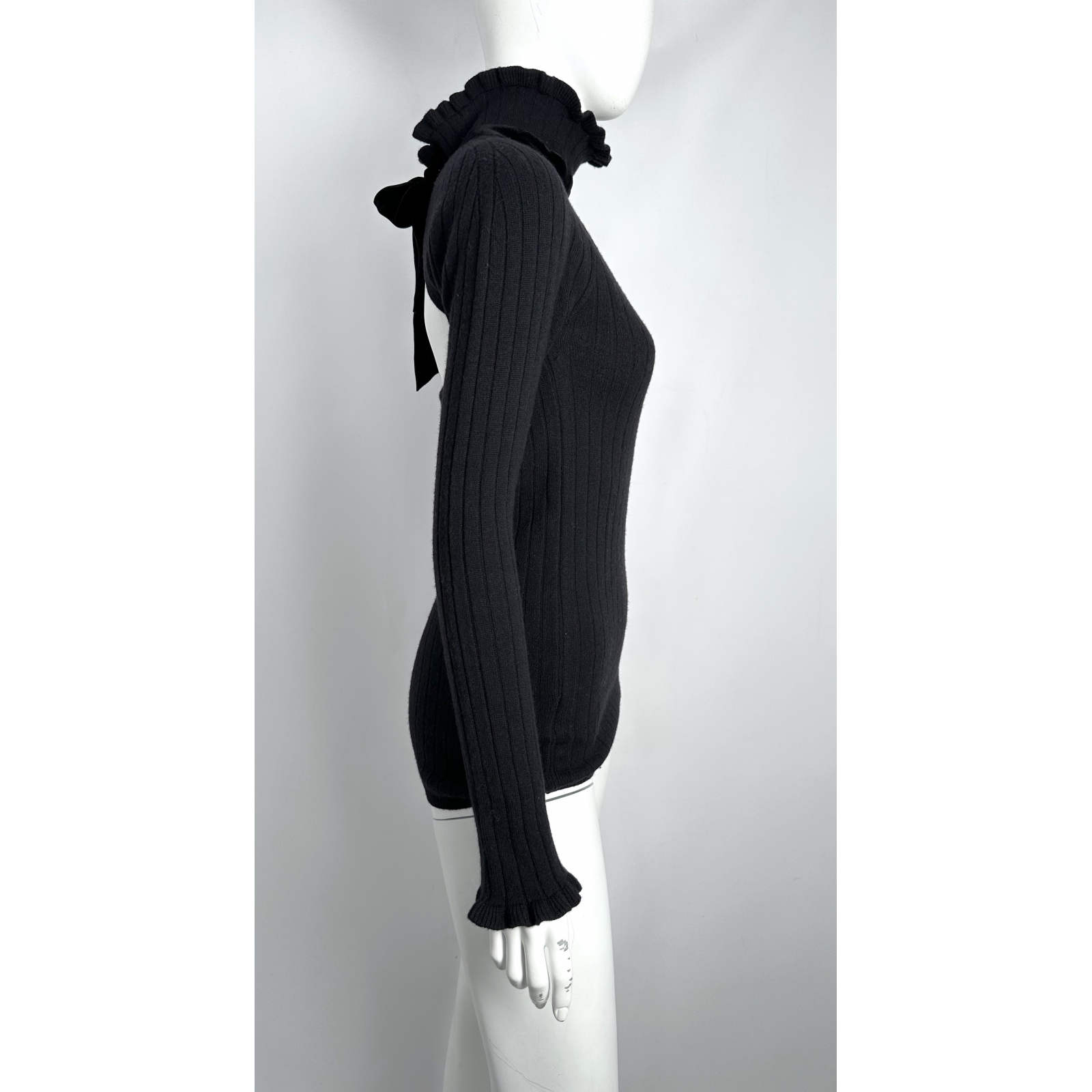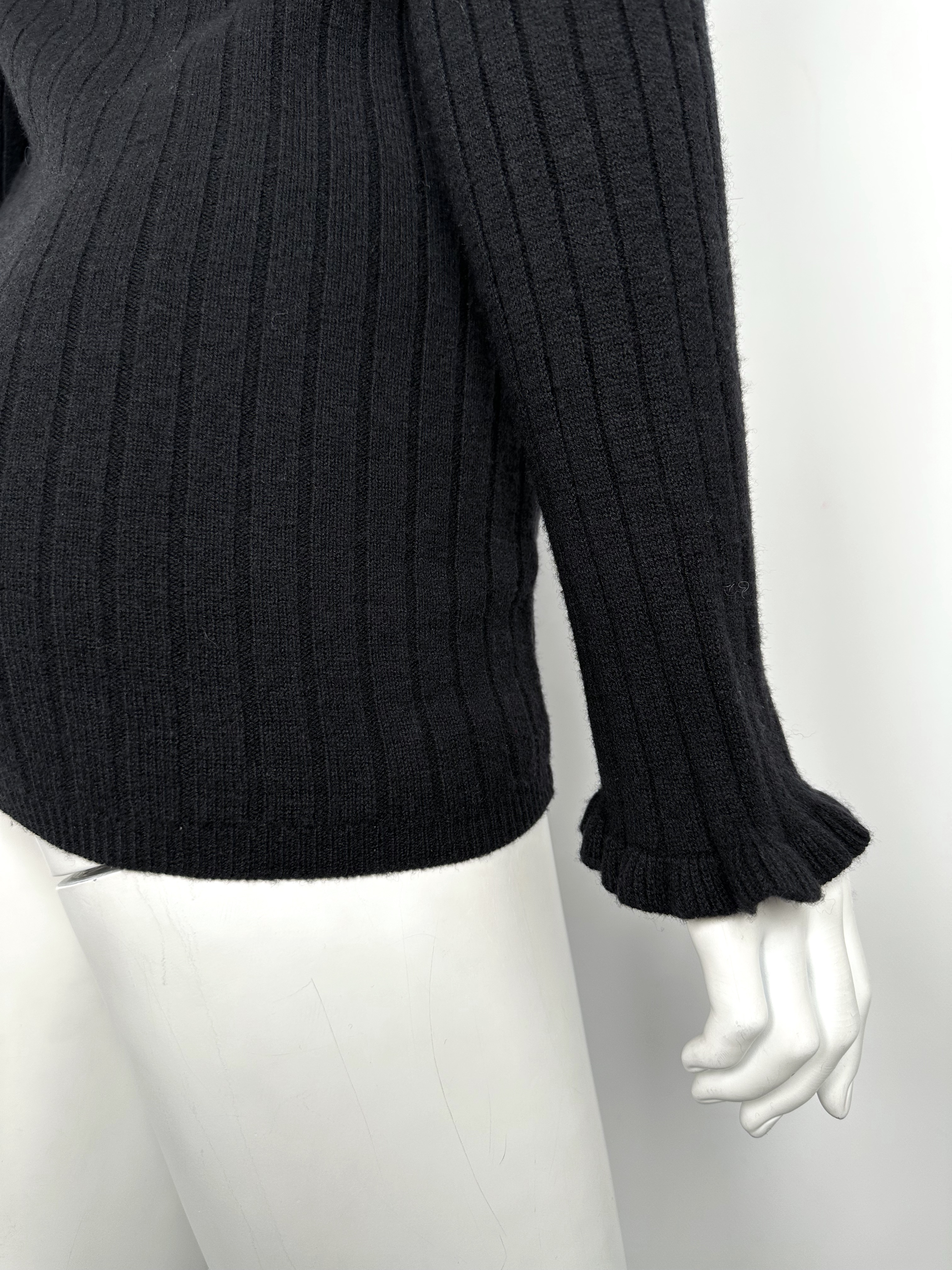 "Czarny sweter z odkrytymi plecami, prążkowany materiał, wiązany z tyłu w szyi, ozdobny kołnierzyk, falbanka w rękawie. Rozmiar z metki L. Skład : 100% wełna. Wymiary: szerokość mierzona od pachy do pachy 39cm, długość całkowita 69,5cm, długość rękawa 62,5cm."