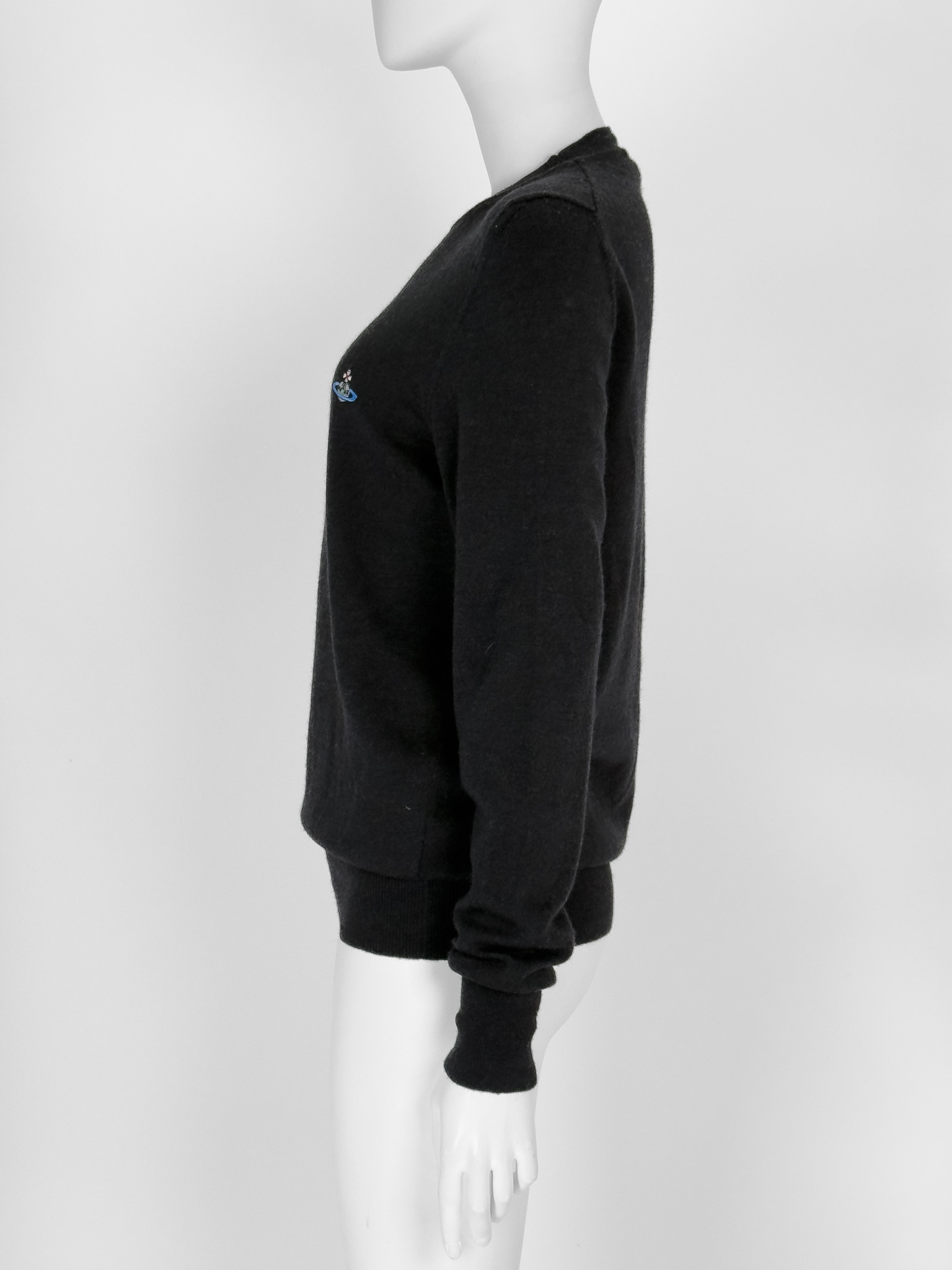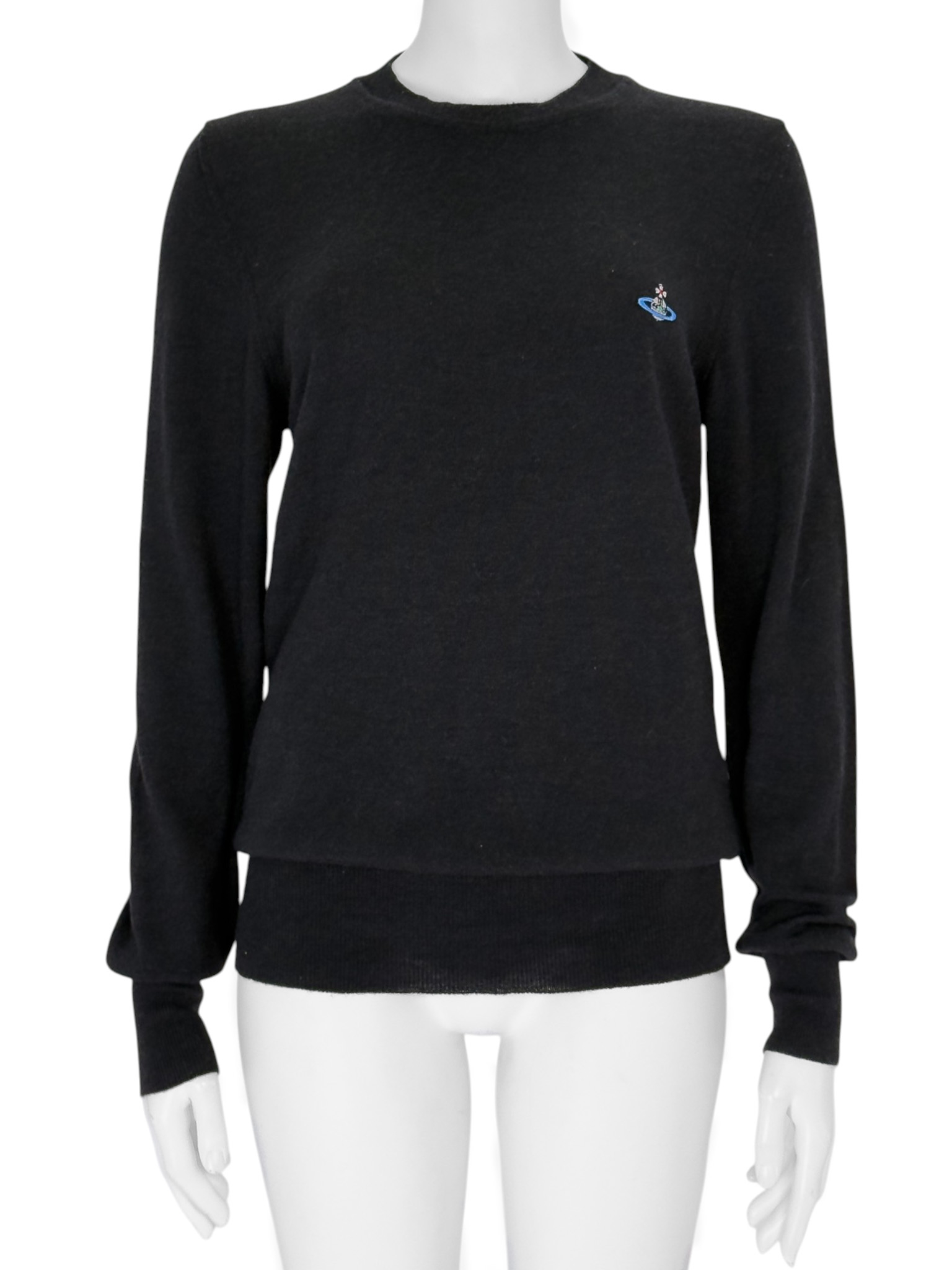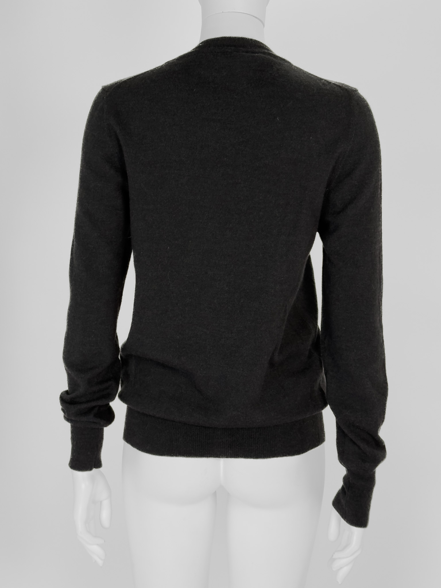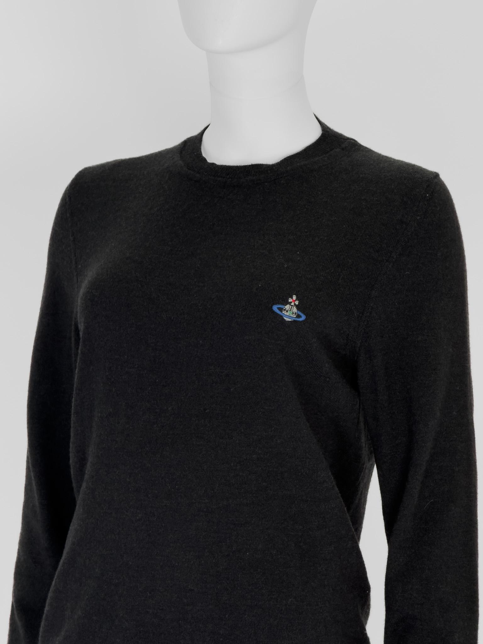 "Ciemnografitowy wełniany sweter, zaokrąglony dekolt, dół, mankiety oraz dekolt wykończone prążkowanym ściągaczem, naszywka z grafiką charakterystyczną dla marki w okolicy biustu. Rozmiar z metki M. Skład: 100% wełna. Wymiary: szerokość mierzona od pachy do pachy 47cm, długość całkowita 71cm."