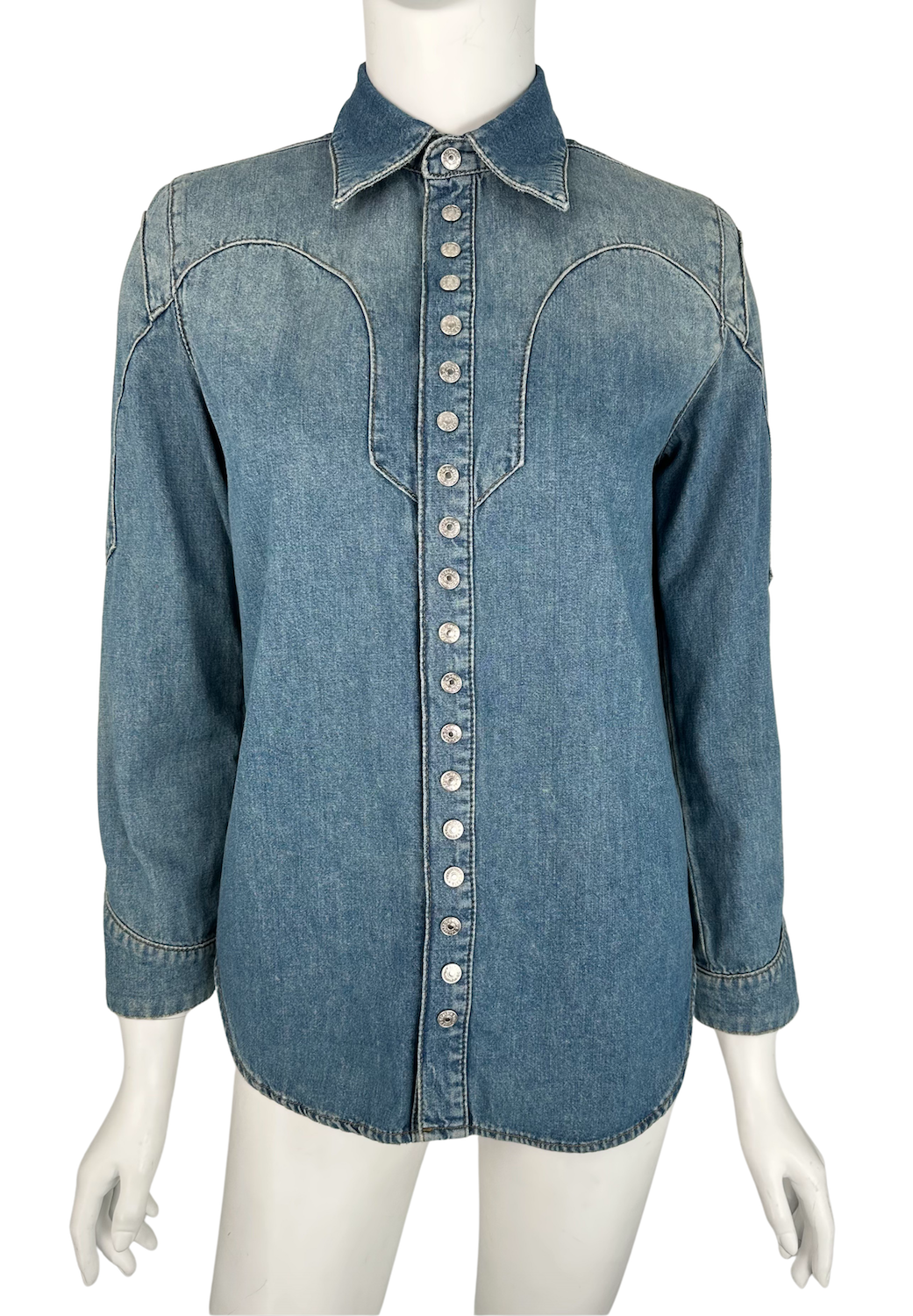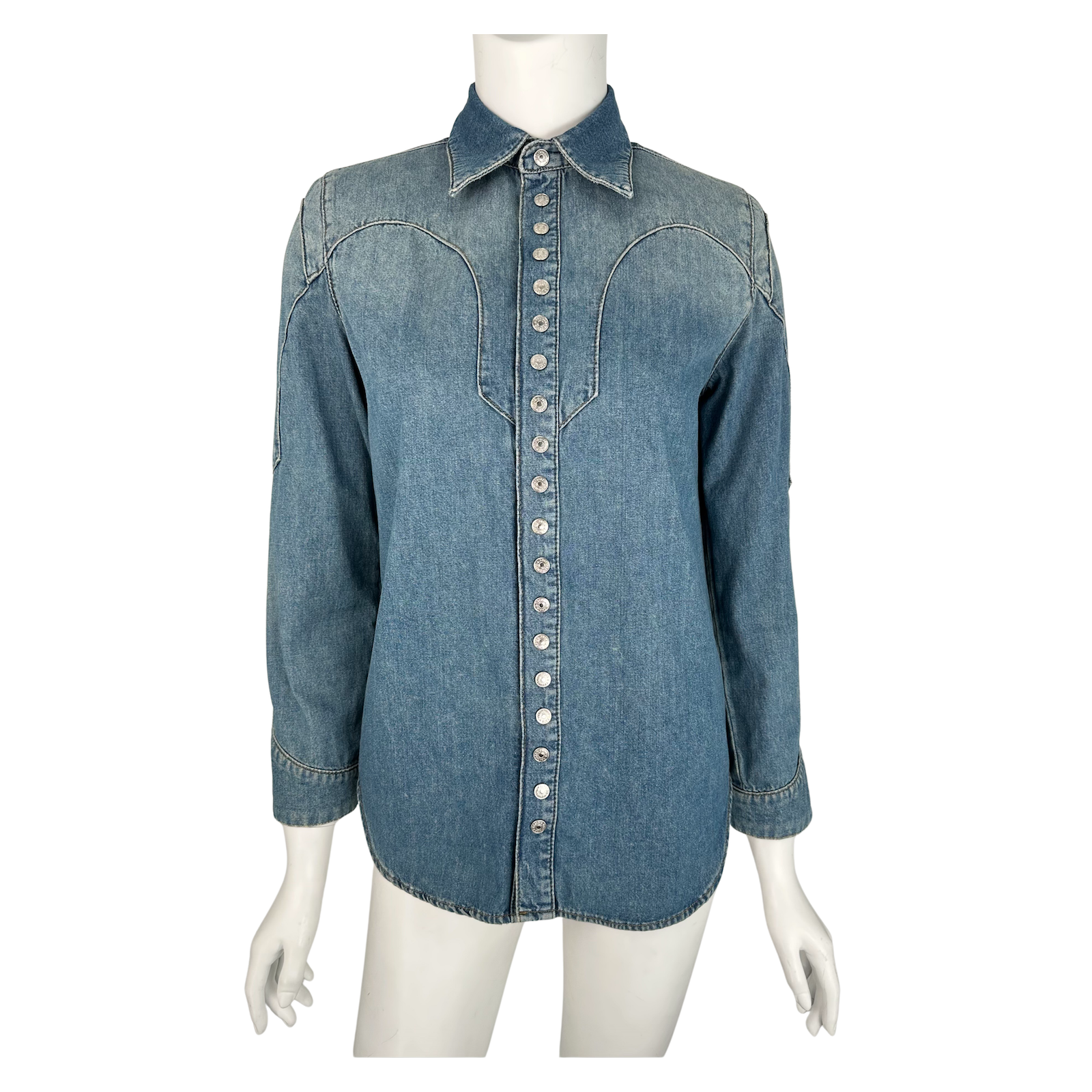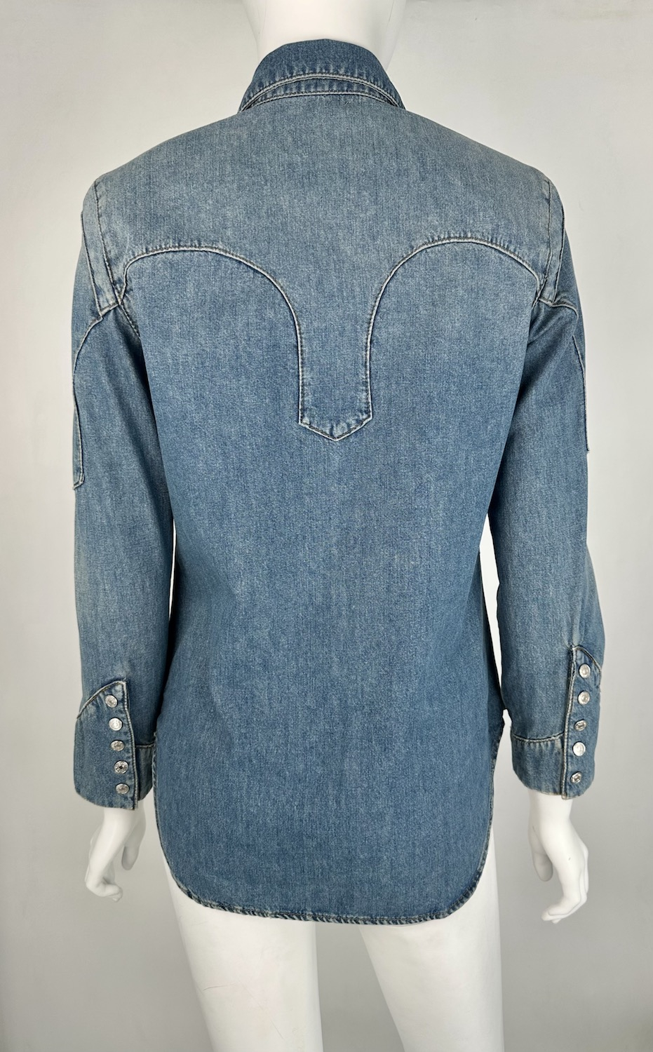 "jeansowa koszula, zapinana z przodu na srebrne logowane zatrzaski, z przeszyciami, długi rękaw, bufki na ramionach, nowa z metkami. Rozmiar XS. Skład: 100% bawełna. Wymiary: długość rękawa od ramienia 55 cm, długość od ramienia 62 cm, szerokość pod pachami 46 cm."
