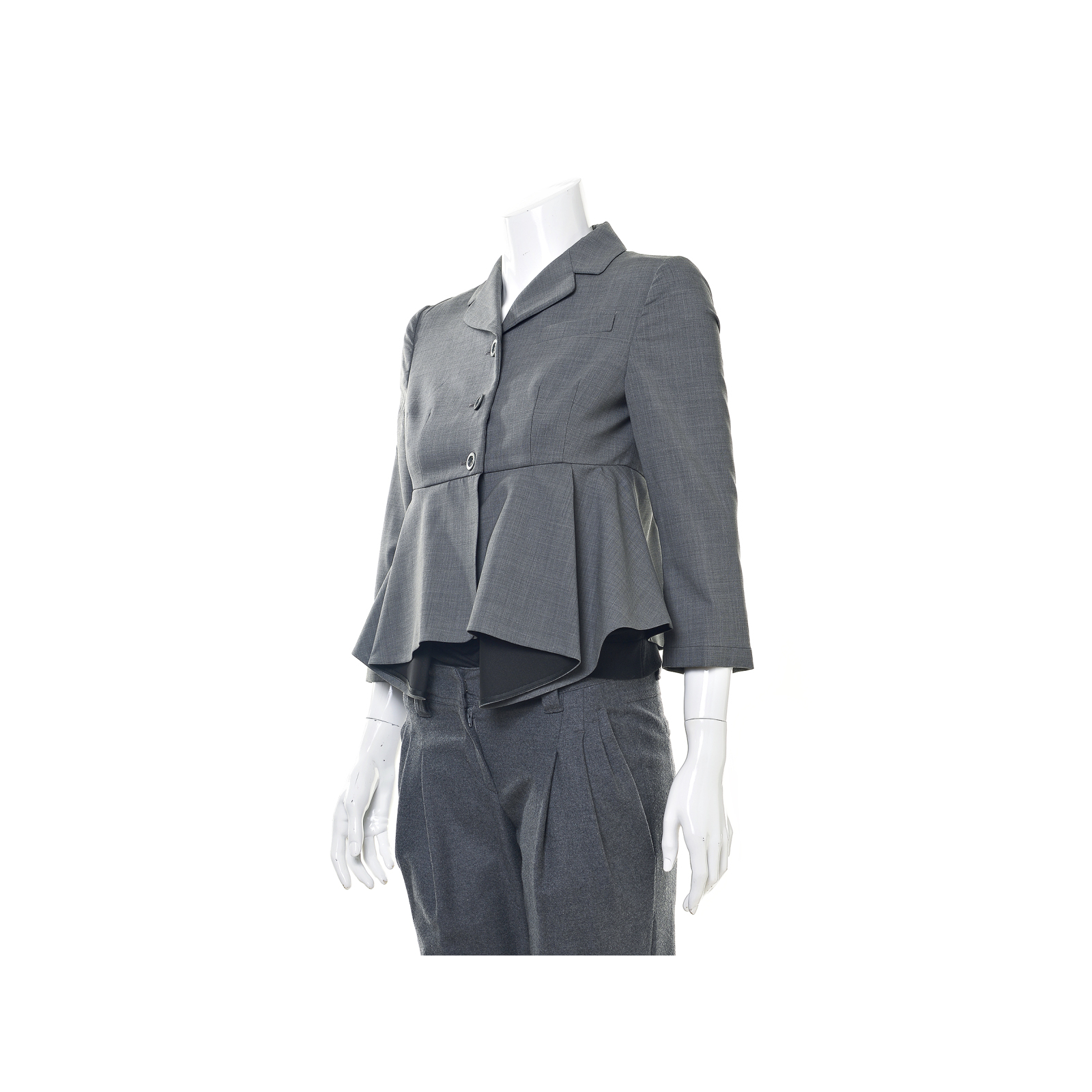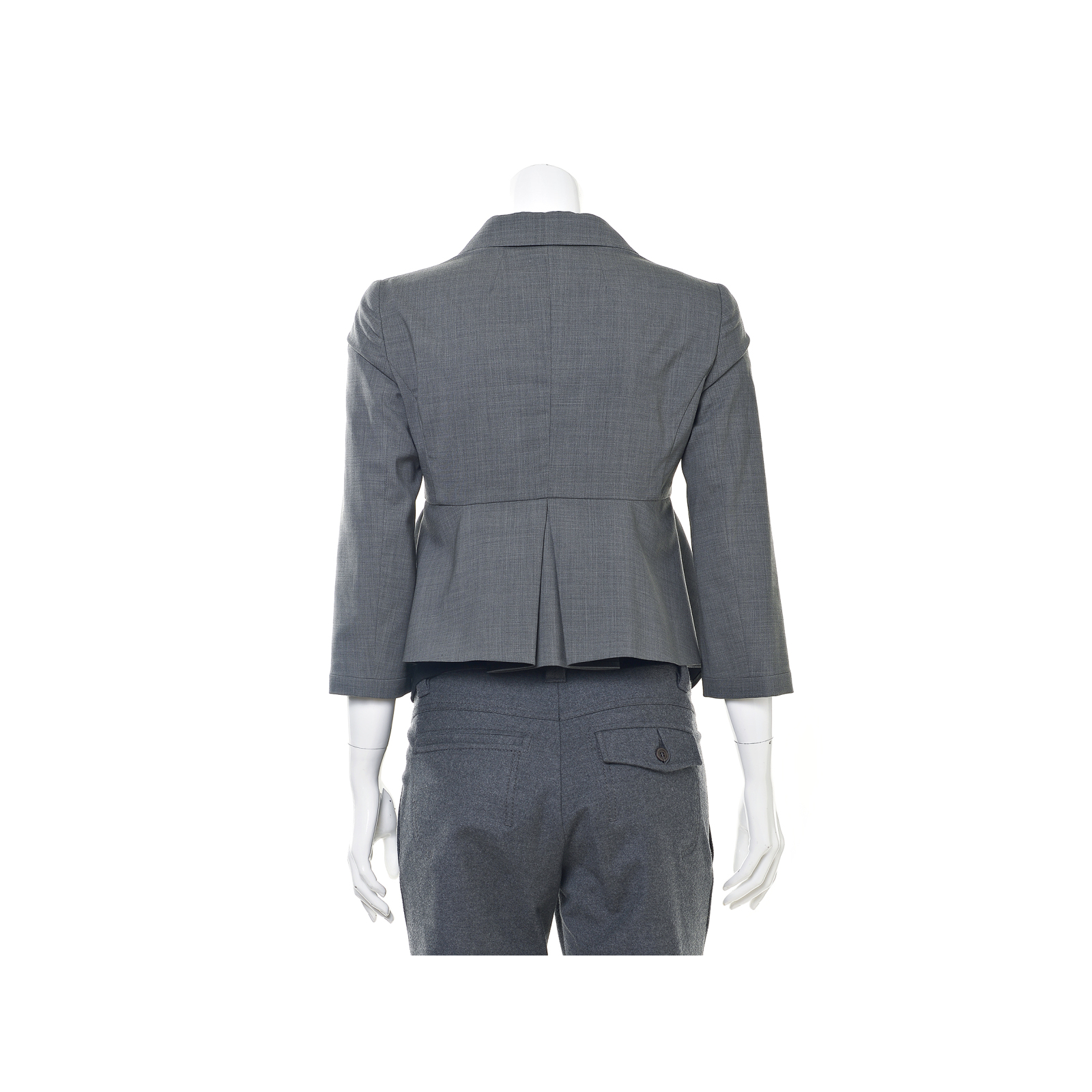 "Żakiet w kolorze szarym, z zakładkami, wełniany, z jedwabną podszewką. Rozmiar S"