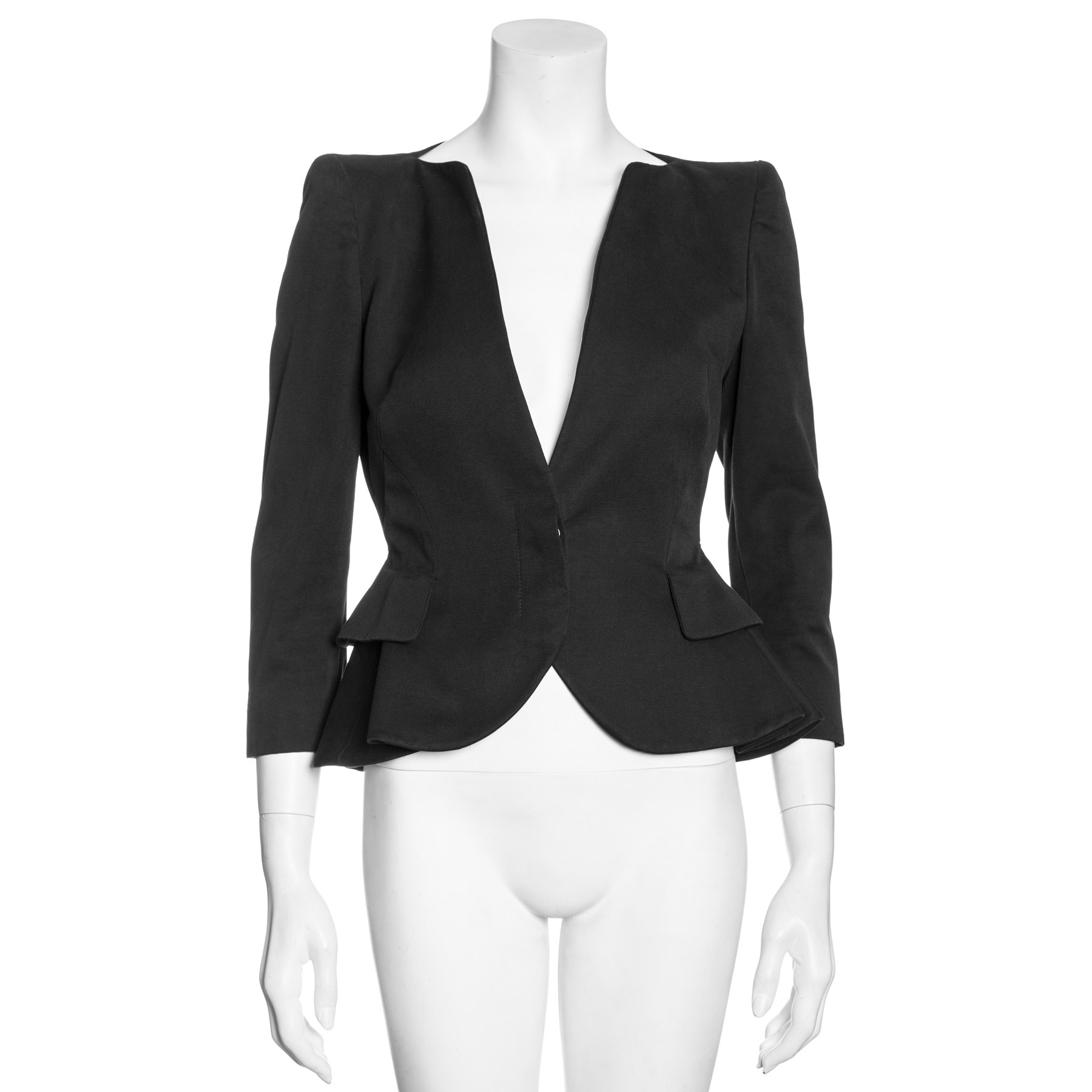"Czarny żakiet z 3/4 rękawem, z baskinką na dole, poduchy, 38; wymiary: ramiona 39 cm, talia 70 cm, dł. rękawa 50 cm, dł. całkowita 54 cm; skład: 100% bawełna"