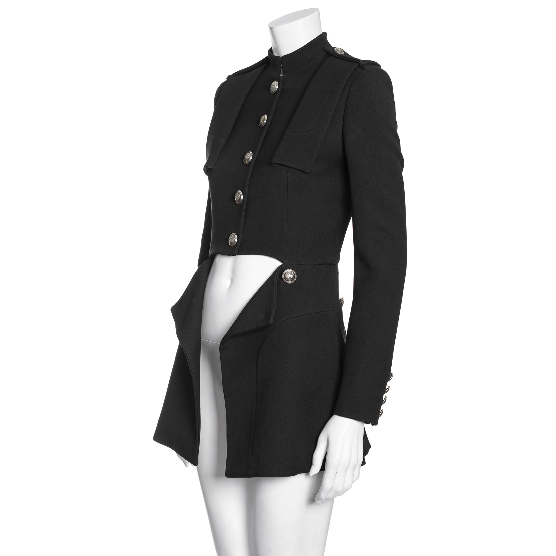 "Czarny długi smokingowy żakiet, srebrny guziki z herbami, pagony, rozmiar 38, z tyłu zakładki"
