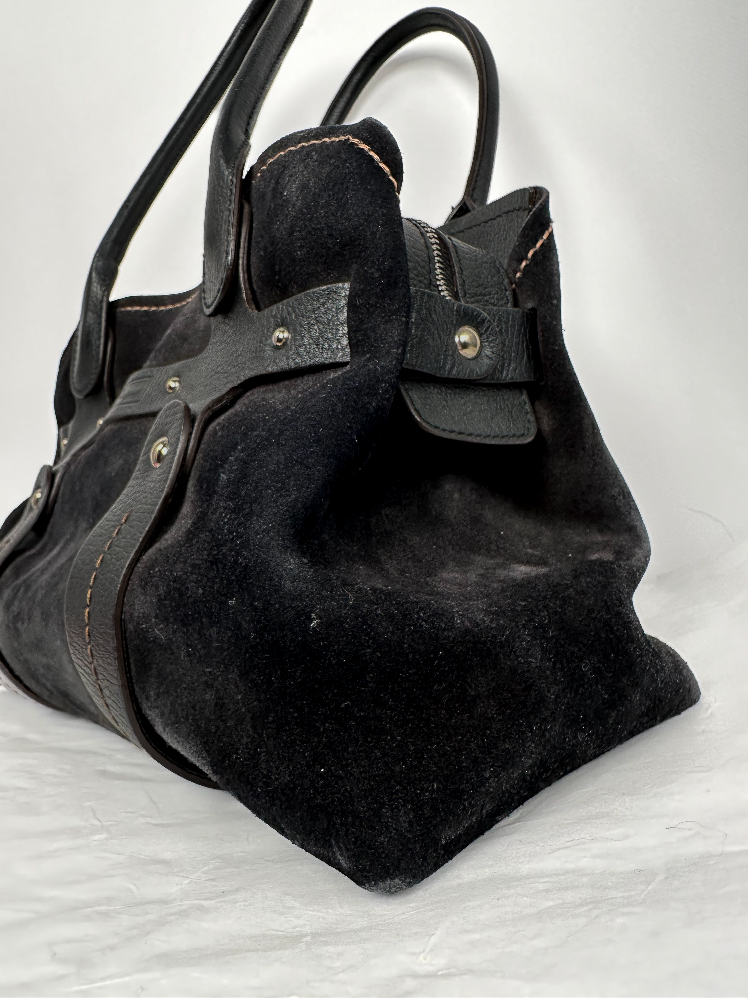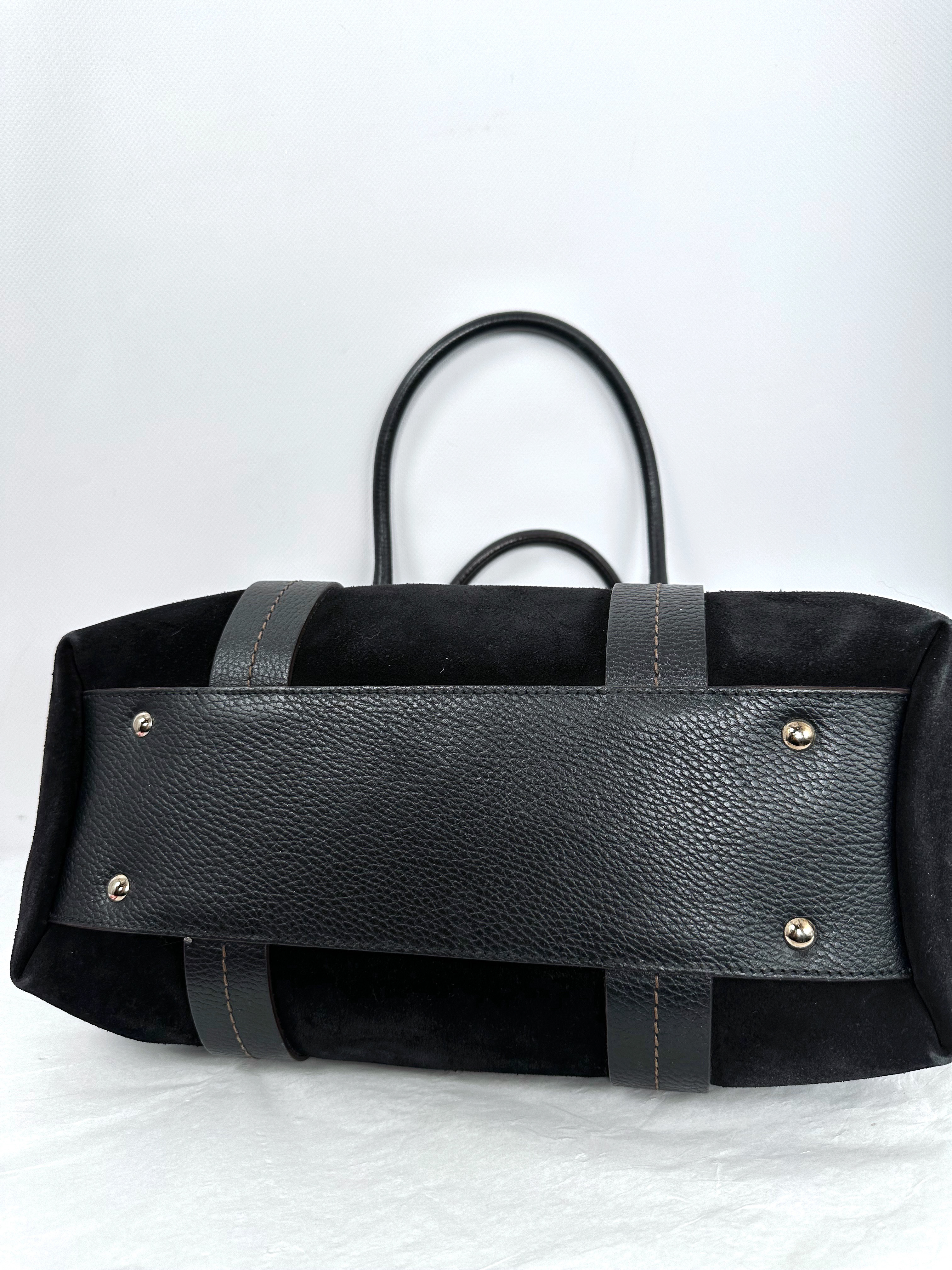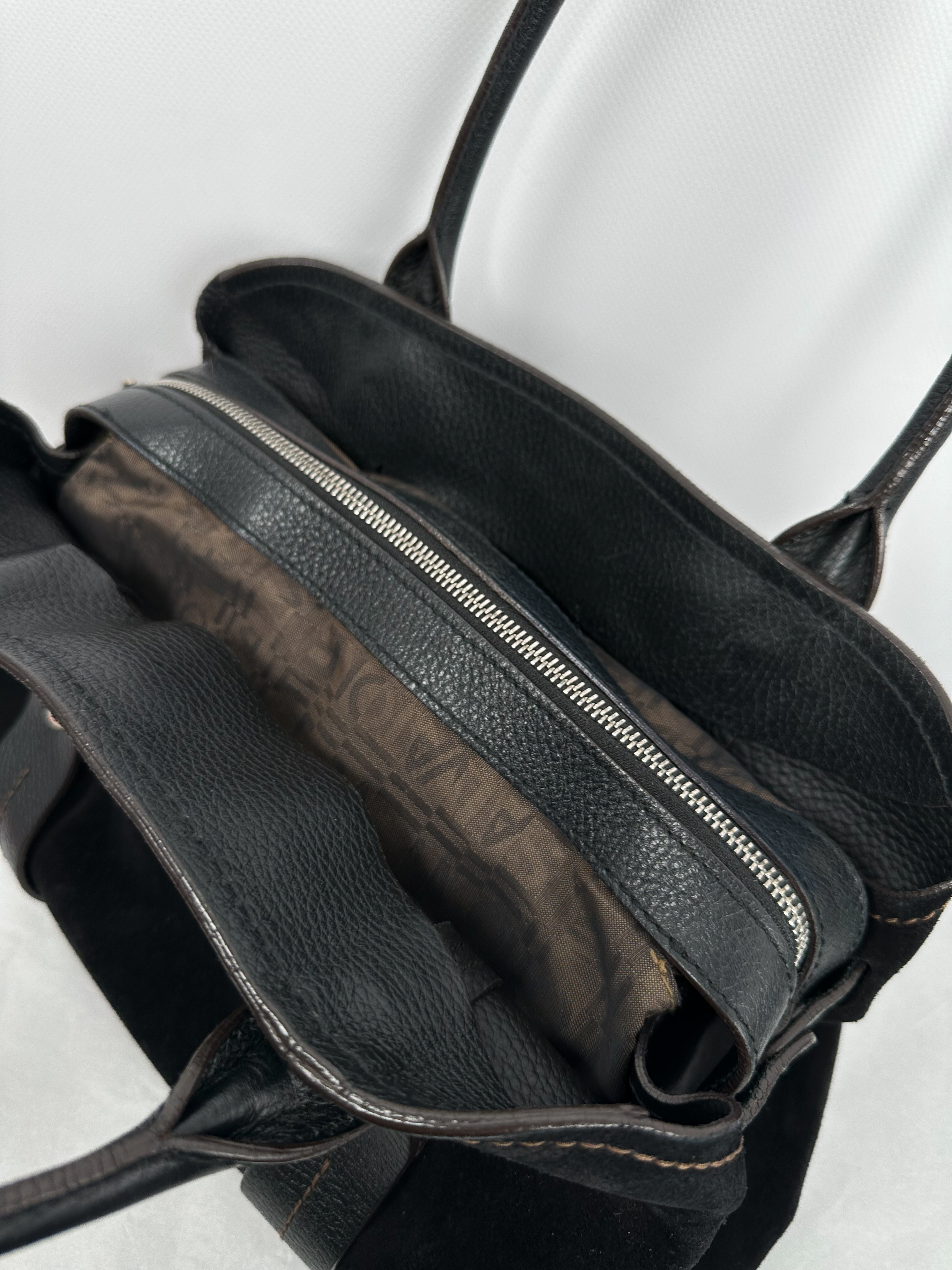 "Brązowo-czarna zamszowa torebka, ozdobiona skórzanymi wstawkami, dwa uchwyty do ręki, brązowe przeszycia, wytłaczane logo marki na przodzie, srebrne okucia, trzy komory wewnątrz, jedna zapinana na srebrny logowany suwak, brązowe logowane wnętrze. Stan dobry, przetarte rogi torebki. Wymiary: szerokość 37cm, wysokość 21cm, głębokość 20cm."