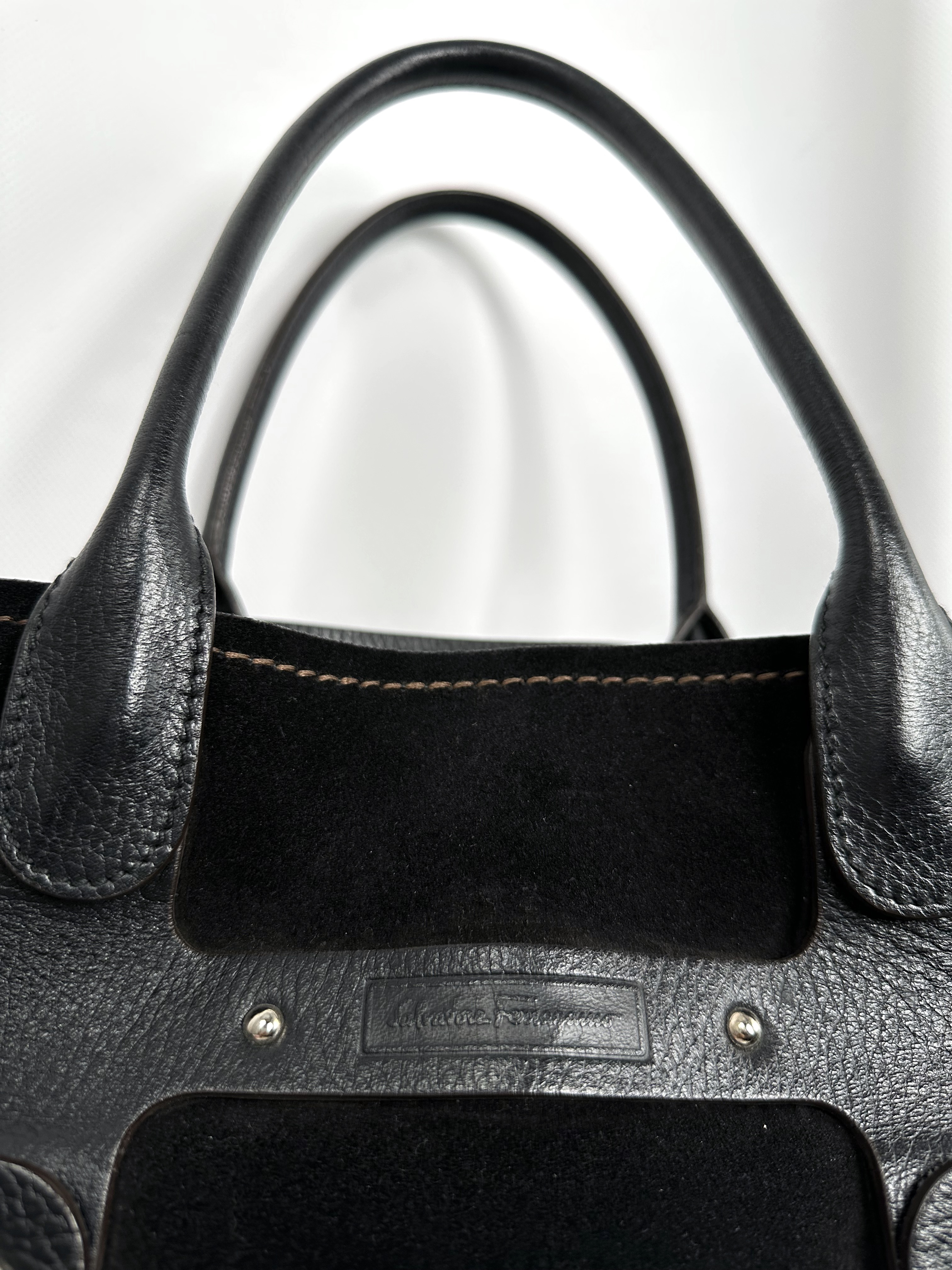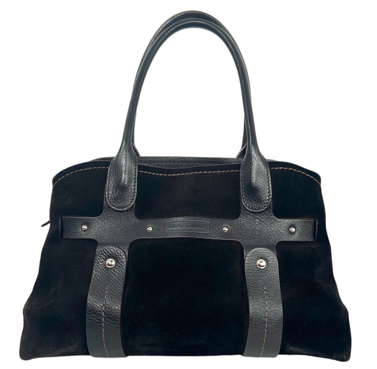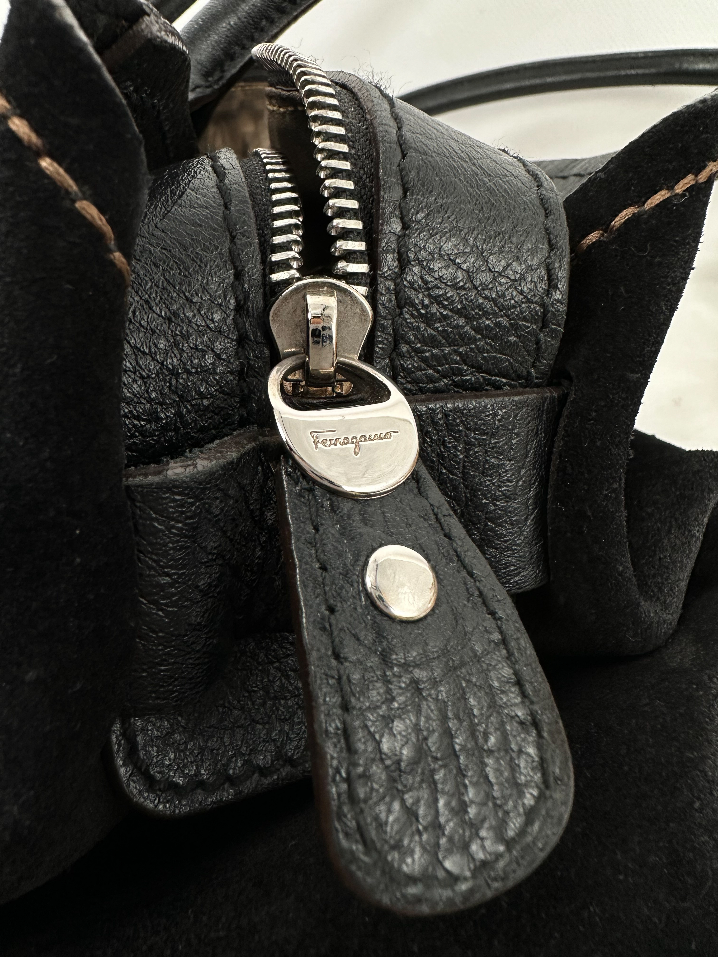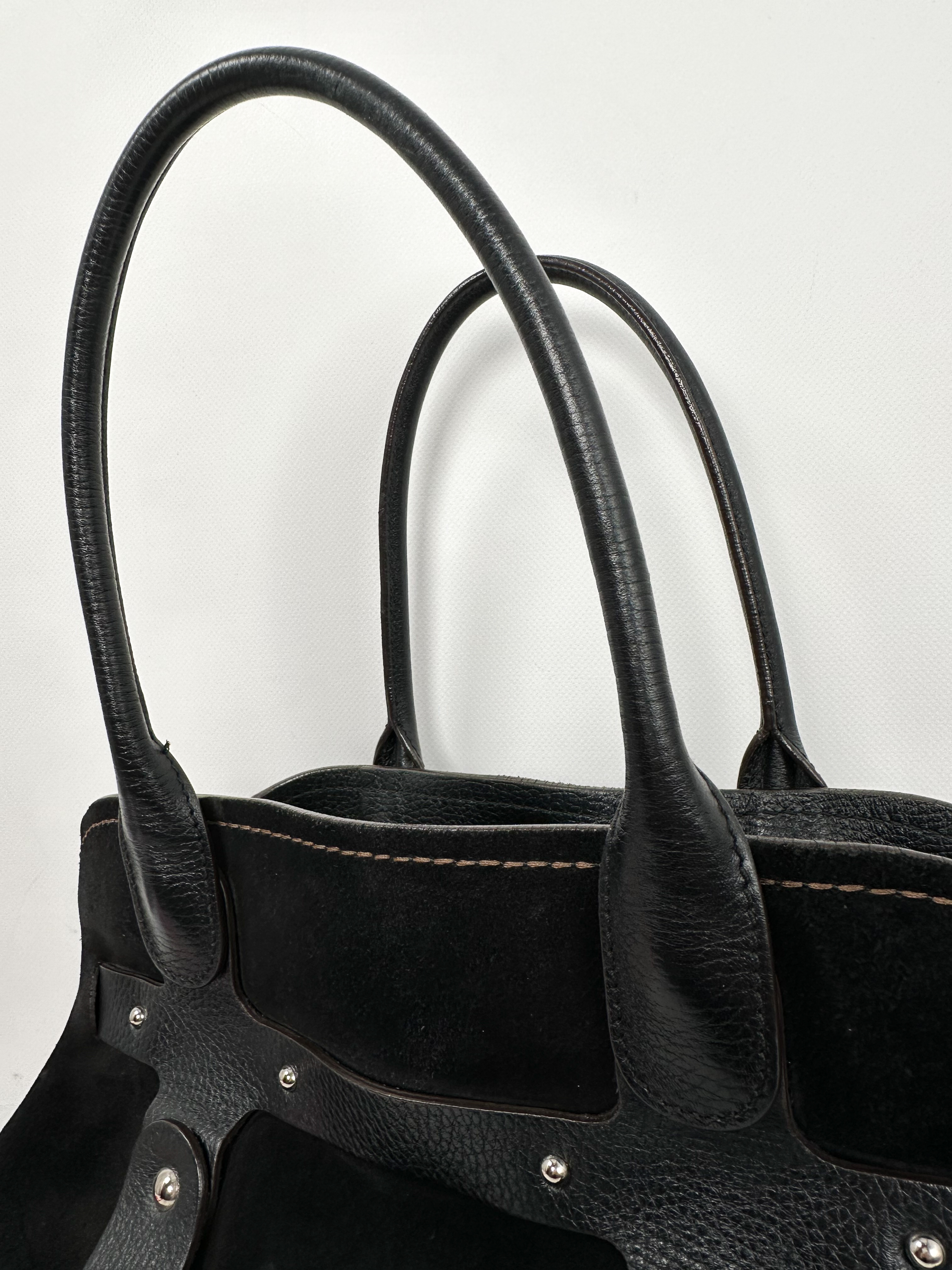 "Brązowo-czarna zamszowa torebka, ozdobiona skórzanymi wstawkami, dwa uchwyty do ręki, brązowe przeszycia, wytłaczane logo marki na przodzie, srebrne okucia, trzy komory wewnątrz, jedna zapinana na srebrny logowany suwak, brązowe logowane wnętrze. Stan dobry, przetarte rogi torebki. Wymiary: szerokość 37cm, wysokość 21cm, głębokość 20cm."