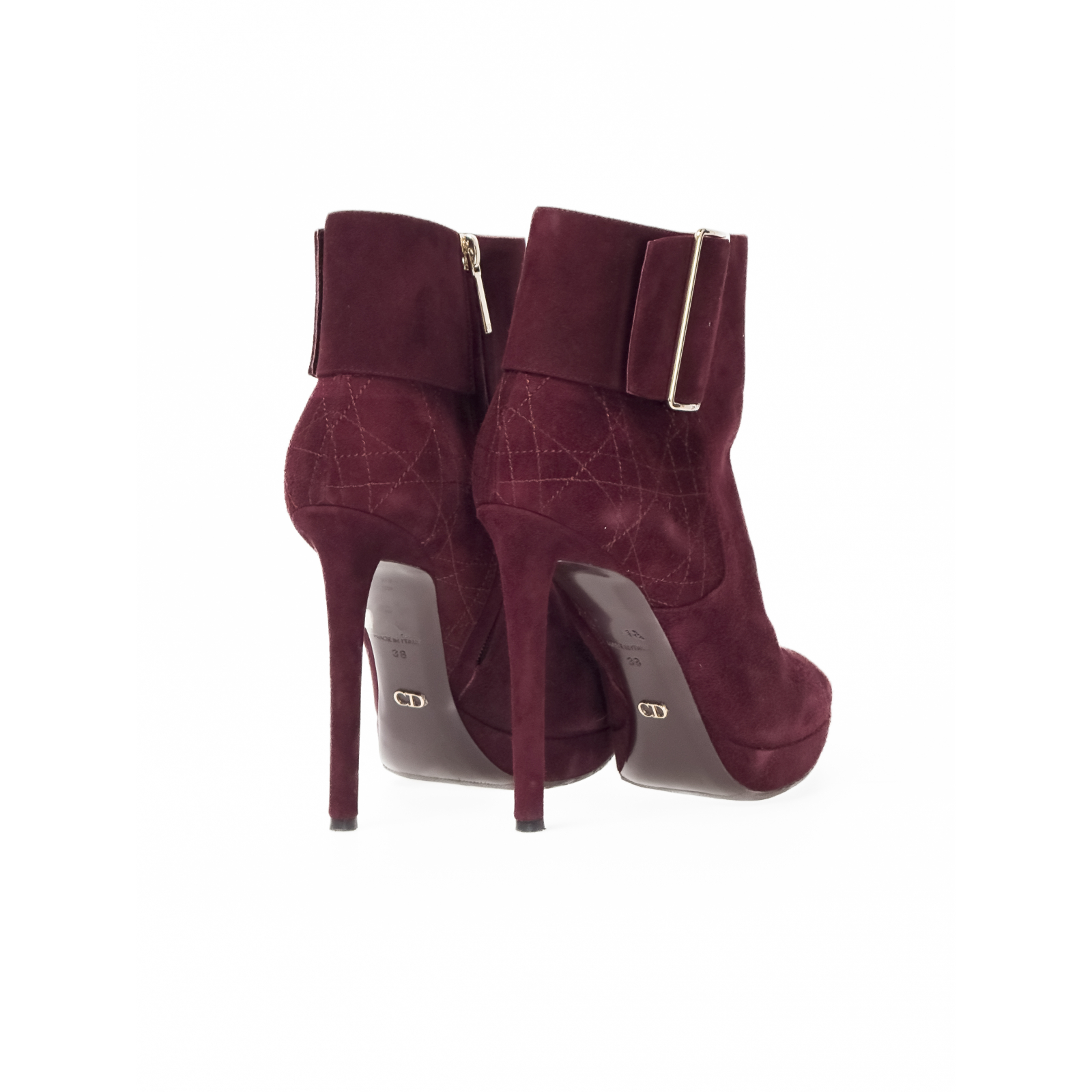 "Bordowe zamszowe botki na obcasie ozdobione złotą klamrą oraz przeszyciami charakterystycznymi dla marki, zapinane na logowany suwak od wewnętrznej strony, platforma w przedniej części, migdałowe noski, podzelowane. Stan bardzo dobry, przetarcia na flekach. Rozmiar 38."