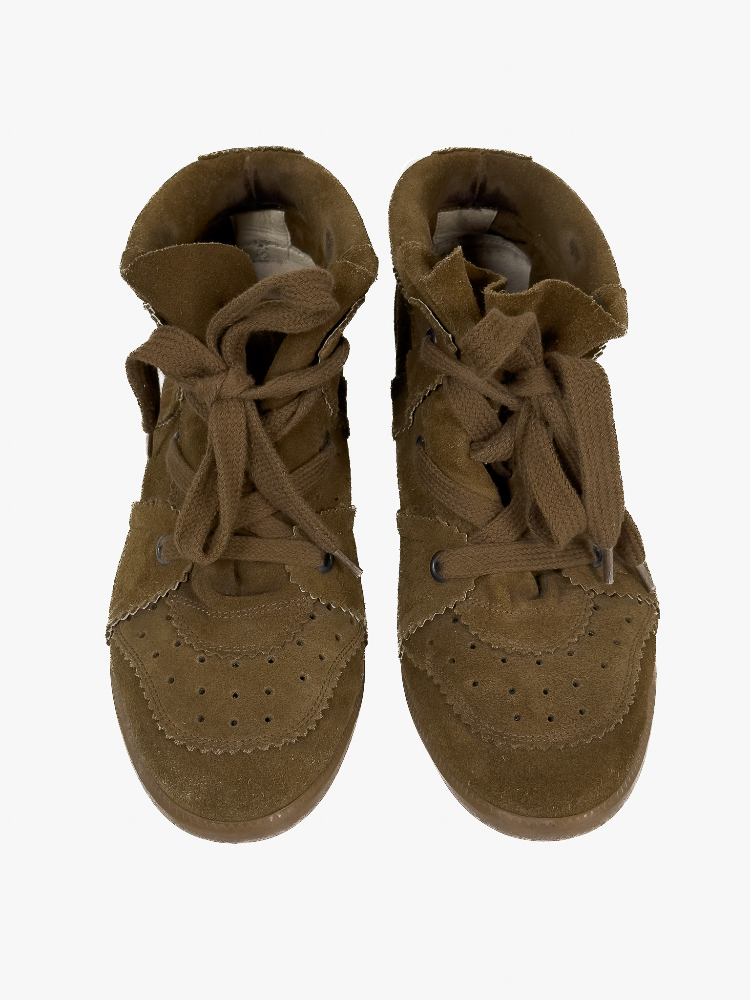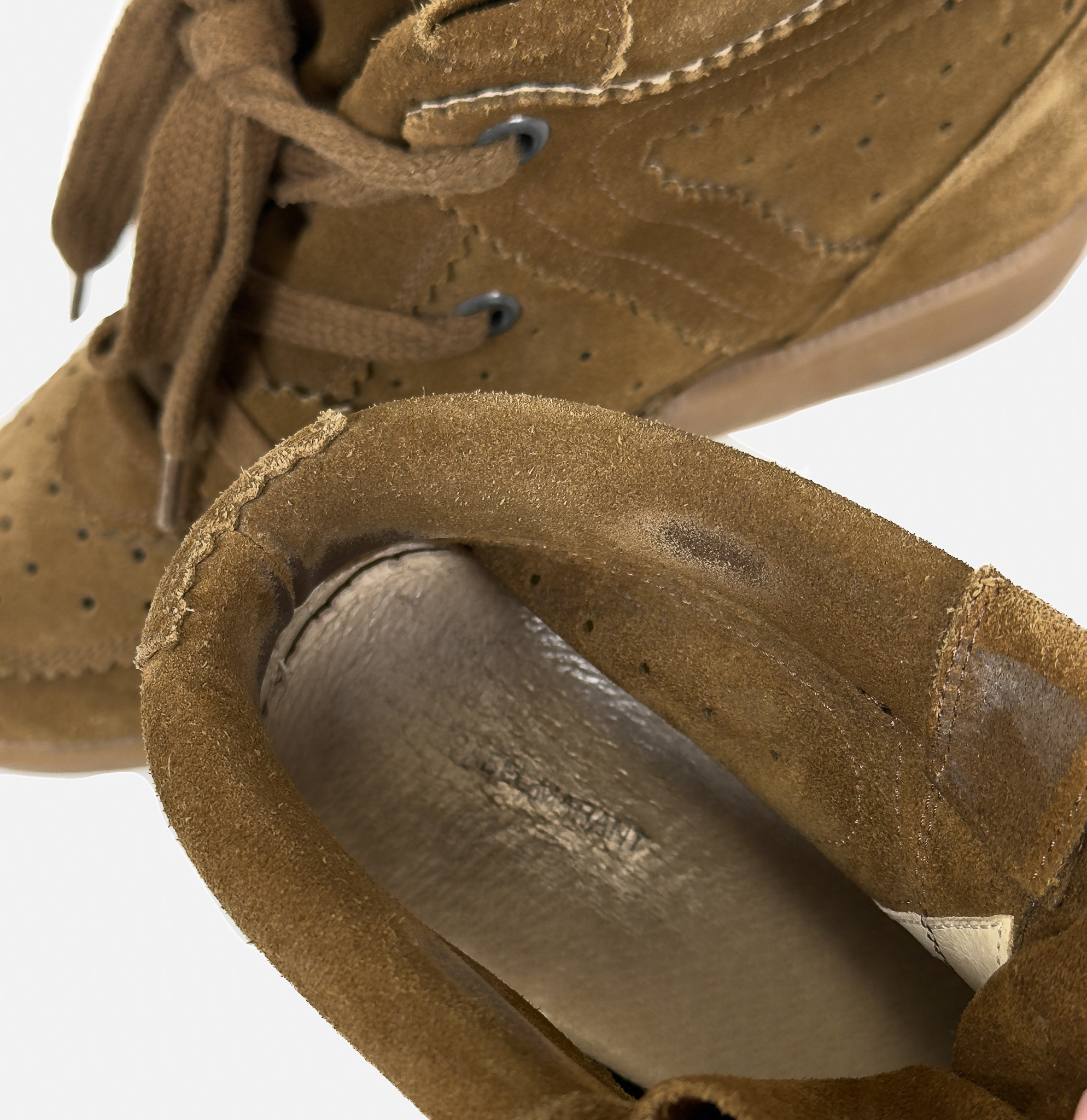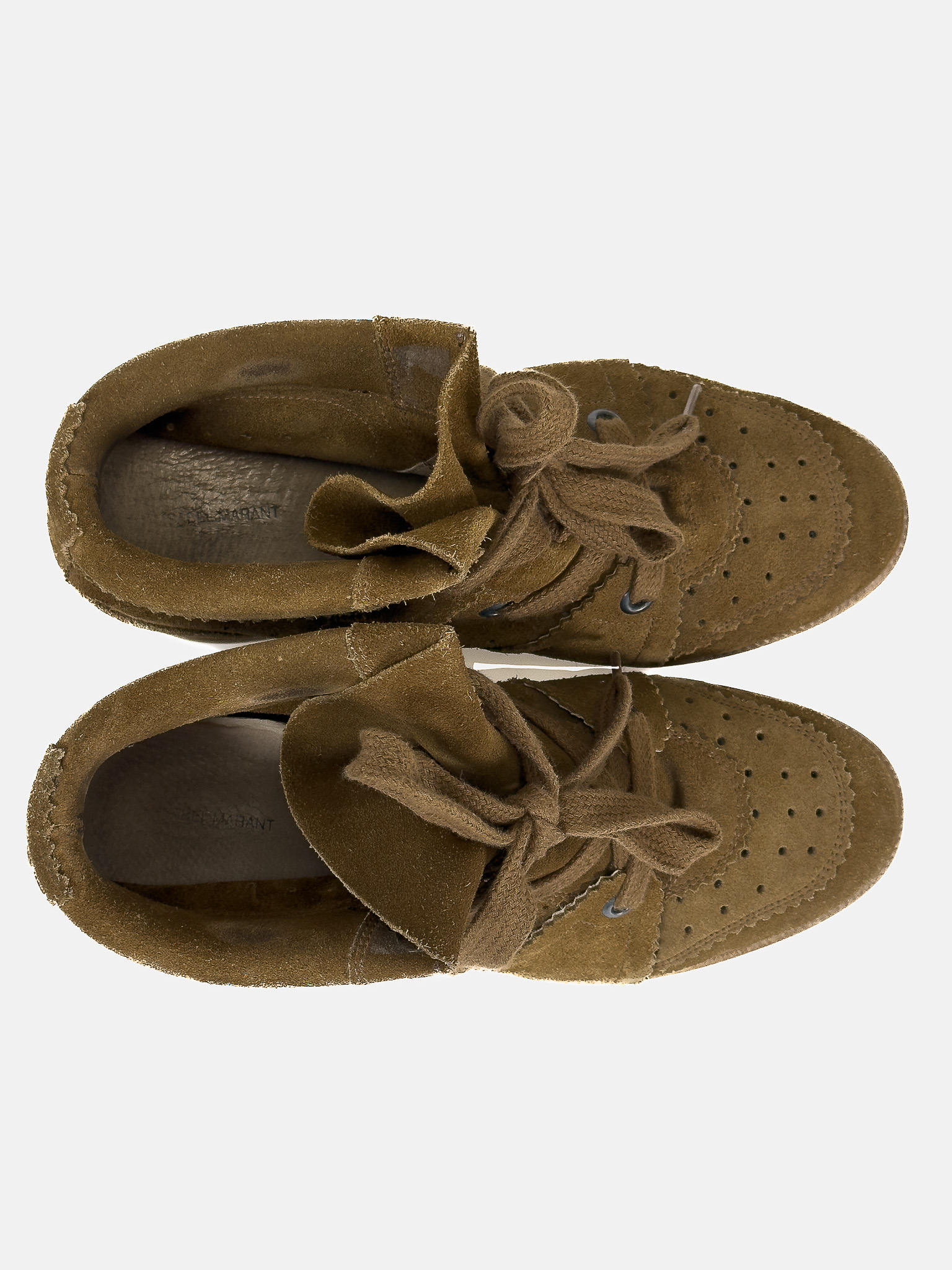 "Camelowe zamszowe botki model 'Bobby',migdałowe noski, sznurowane, na krytej koturnie. Rozmiar 40. Stan bardzo dobry, miejscami przetarcia na zamszu. Pudełko Moliera2 w komplecie."