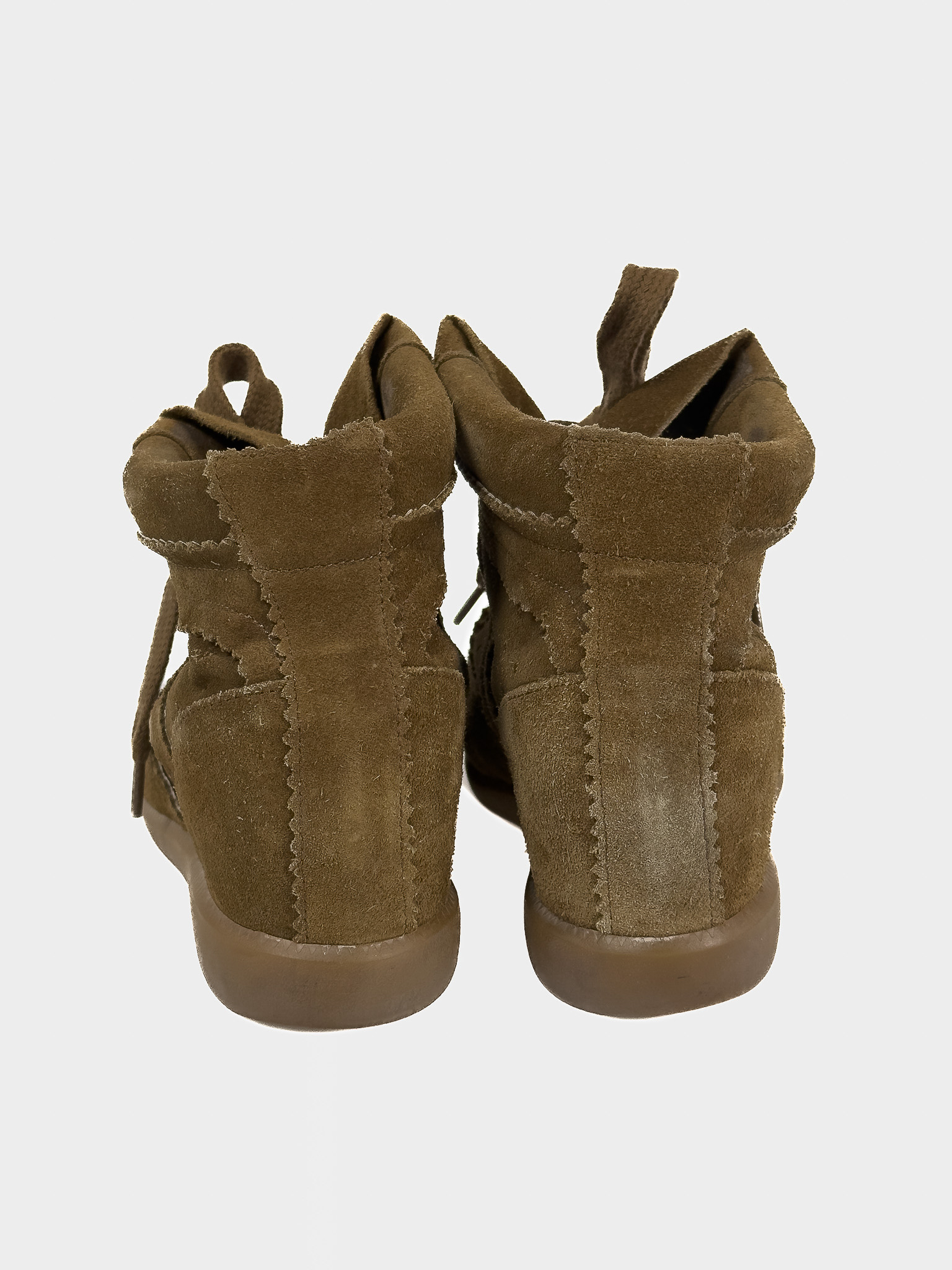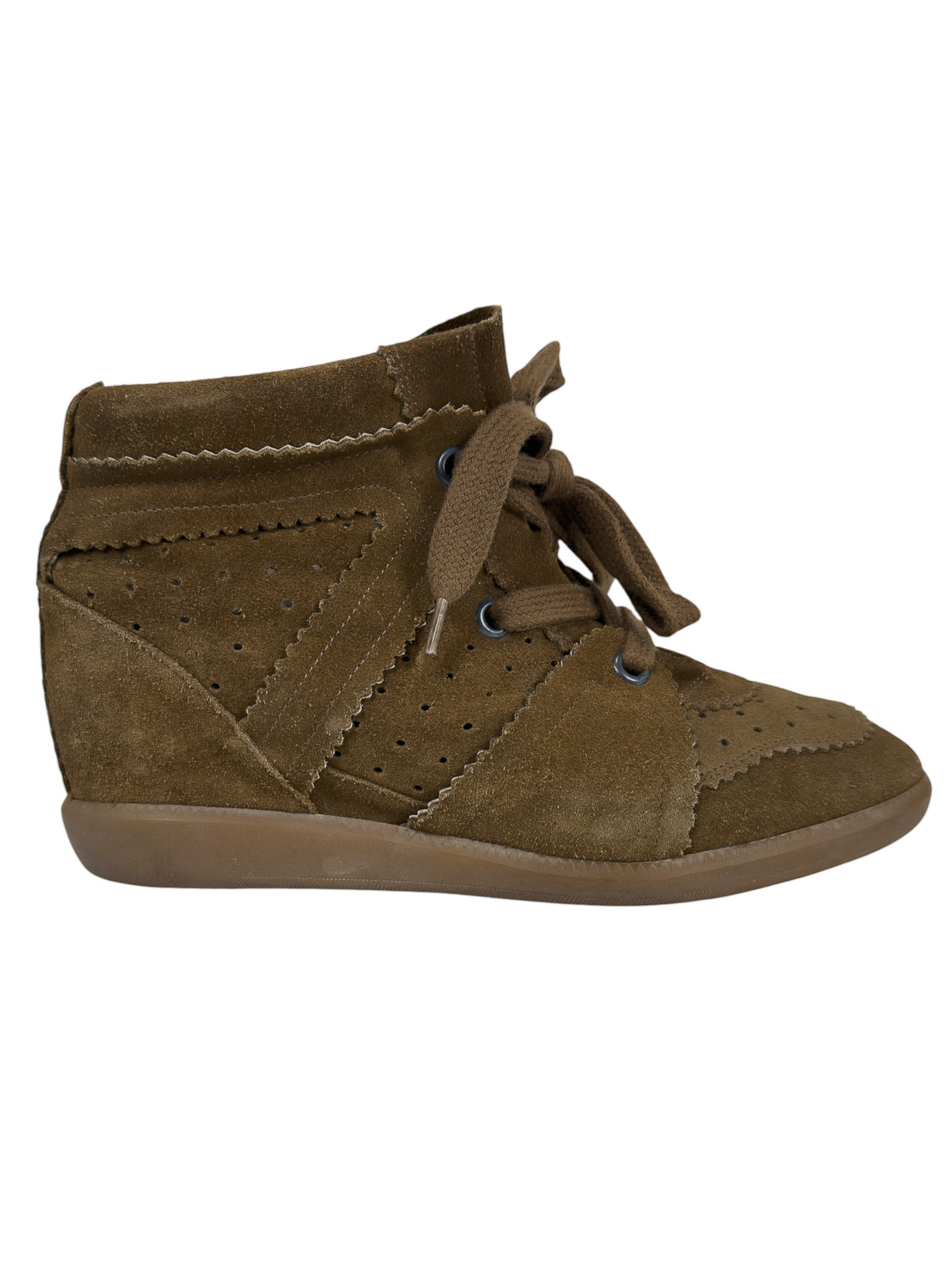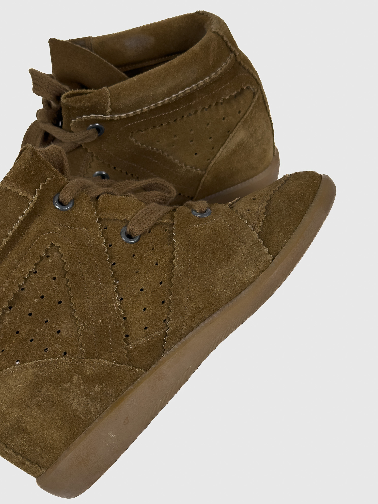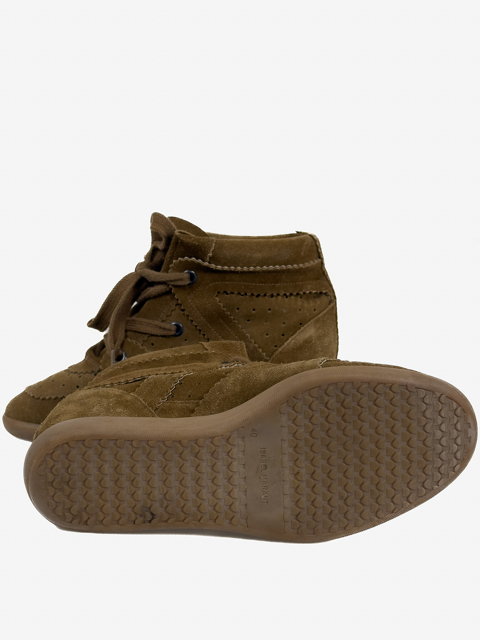 "Camelowe zamszowe botki model 'Bobby',migdałowe noski, sznurowane, na krytej koturnie. Rozmiar 40. Stan bardzo dobry, miejscami przetarcia na zamszu. Pudełko Moliera2 w komplecie."