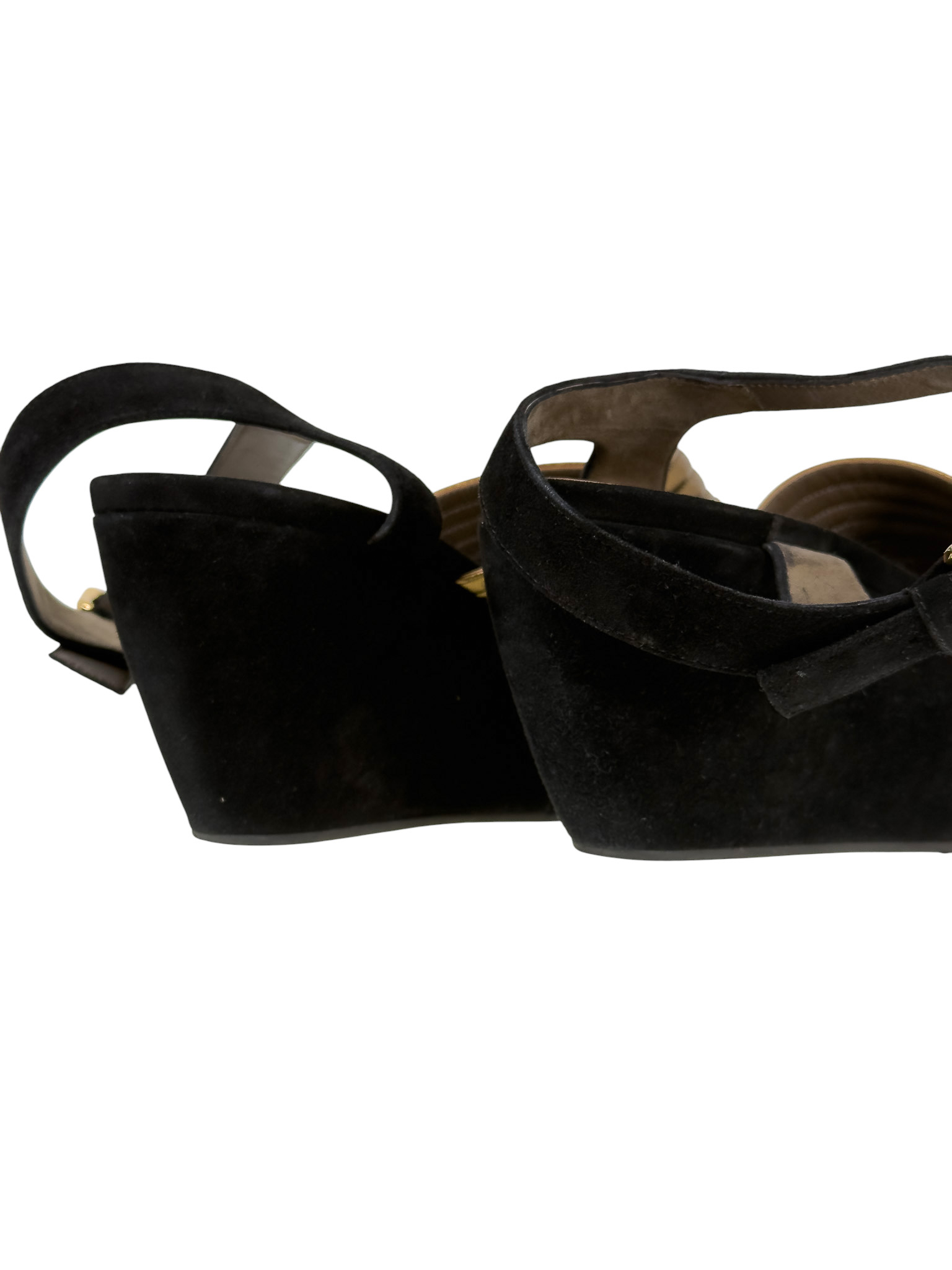 "Czarne zamszowe sandały na platformie, migdałowe noski, odkryte palce oraz pięta, złote paski ozdobione przeszyciami na przodzie, zapinane w okolicy kostki. Stan dobry, posiadają widoczne ślady użytkowania, przetarcia na podeszwie, zarysowania na skórze. Rozmiar 40."