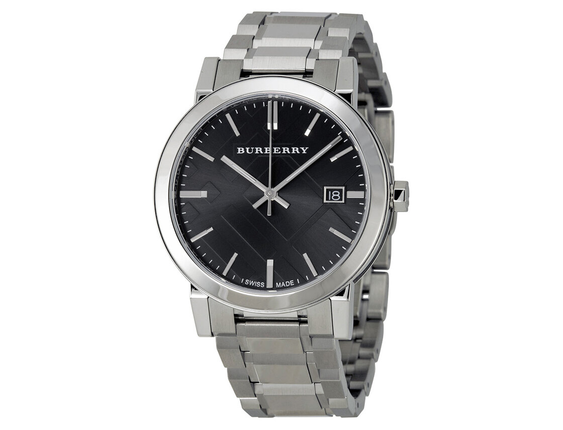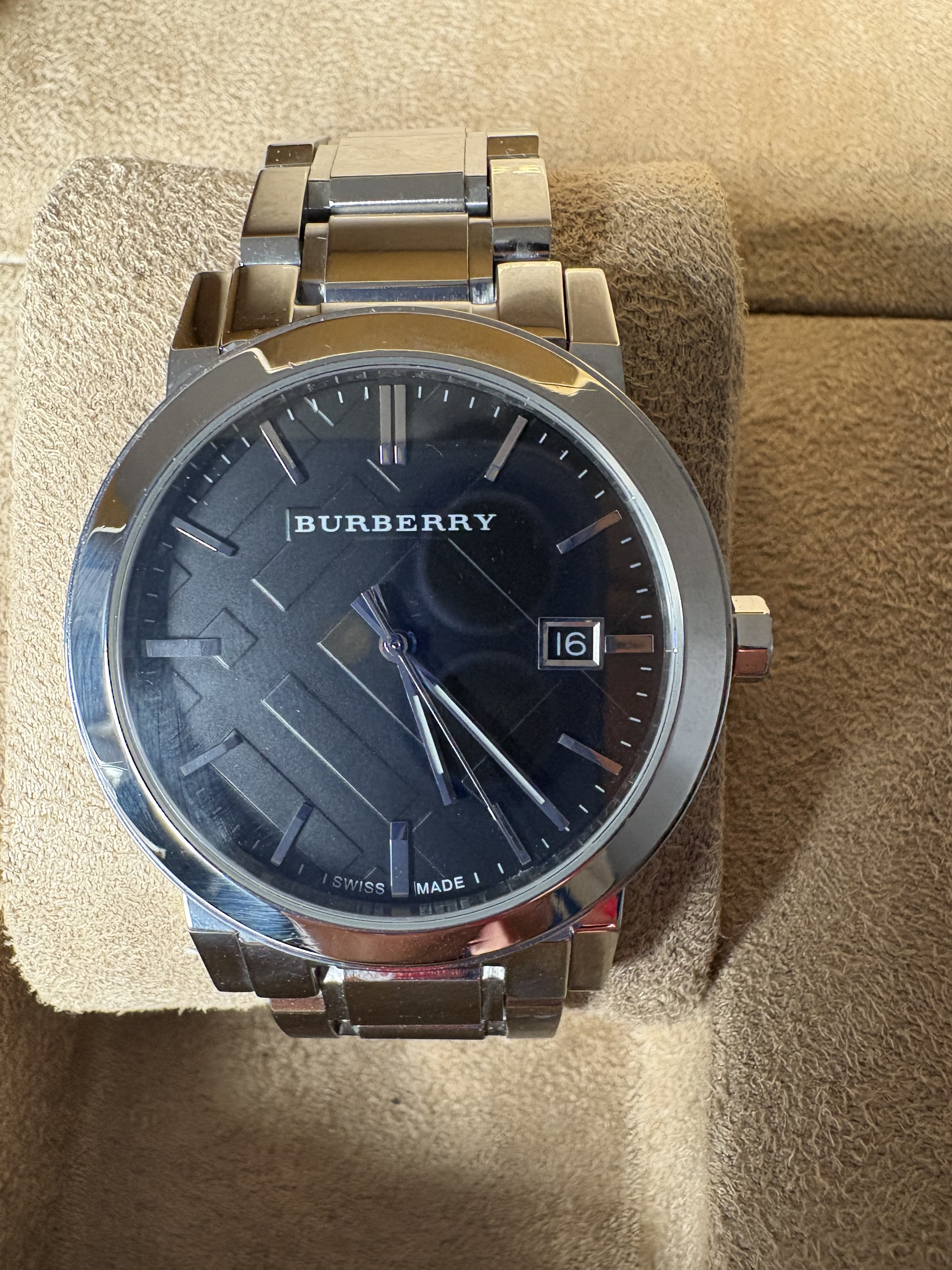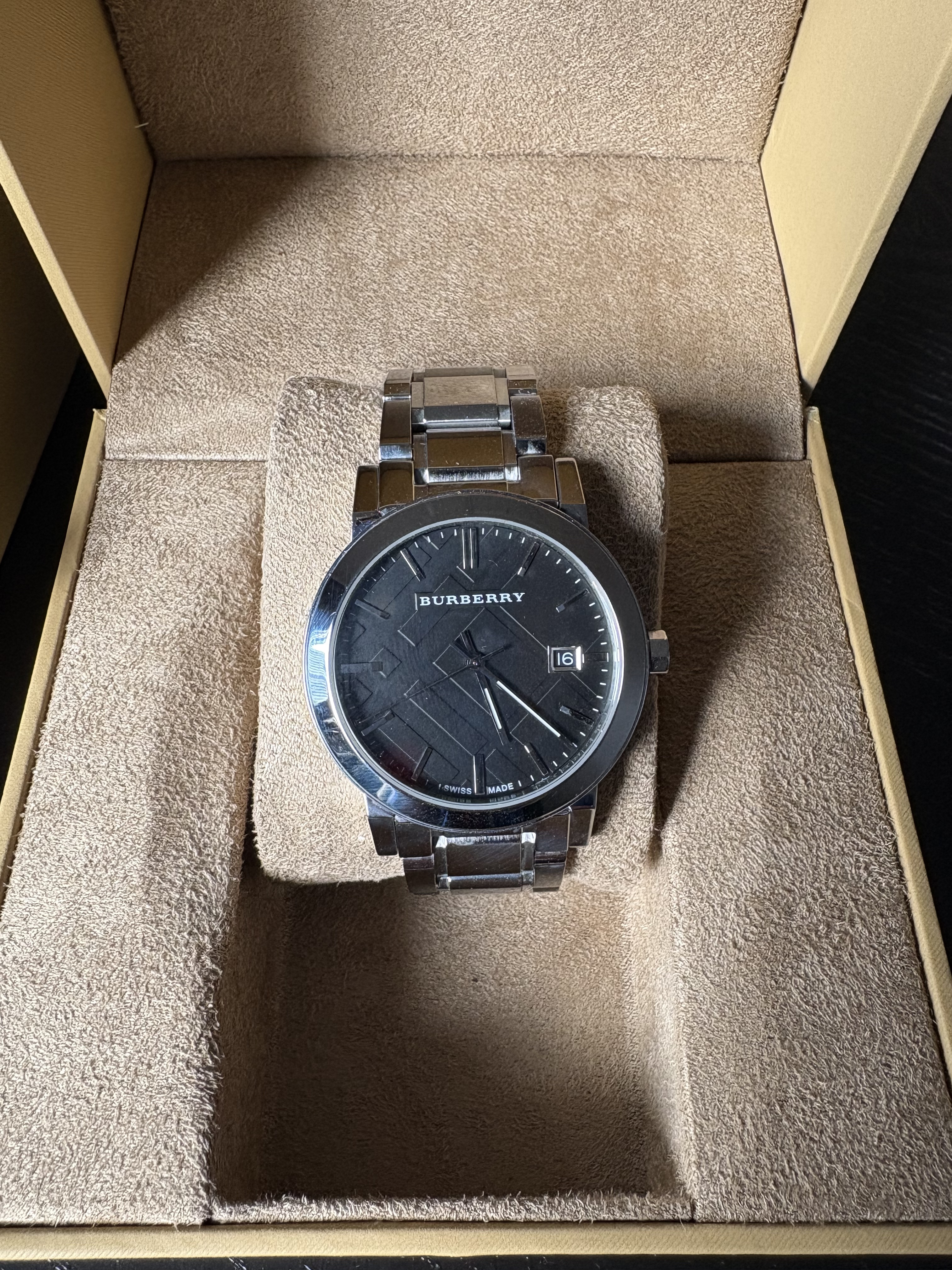 "srebrny zegarek, czarna tarcza, w komplecie z pudełkiem.