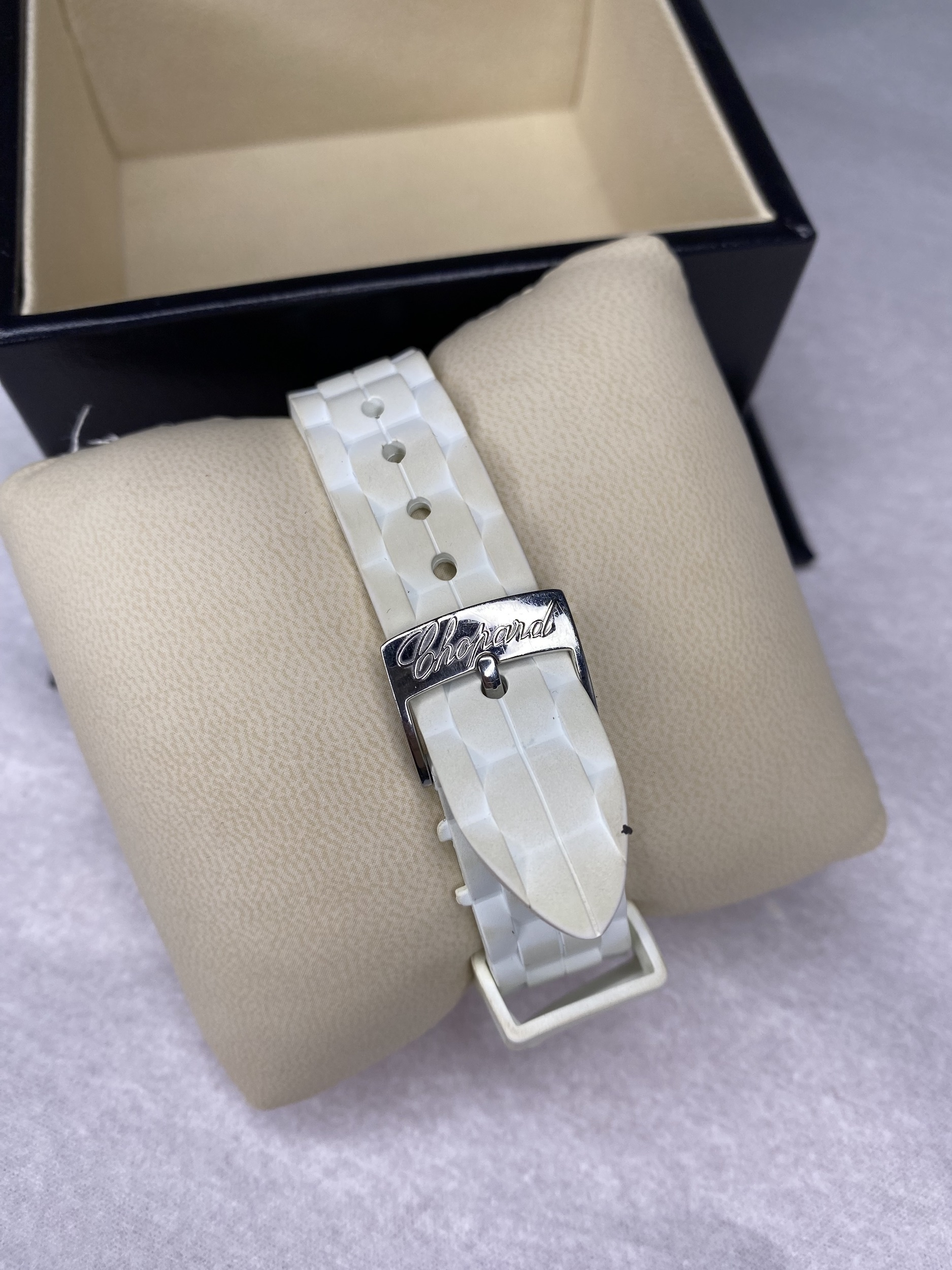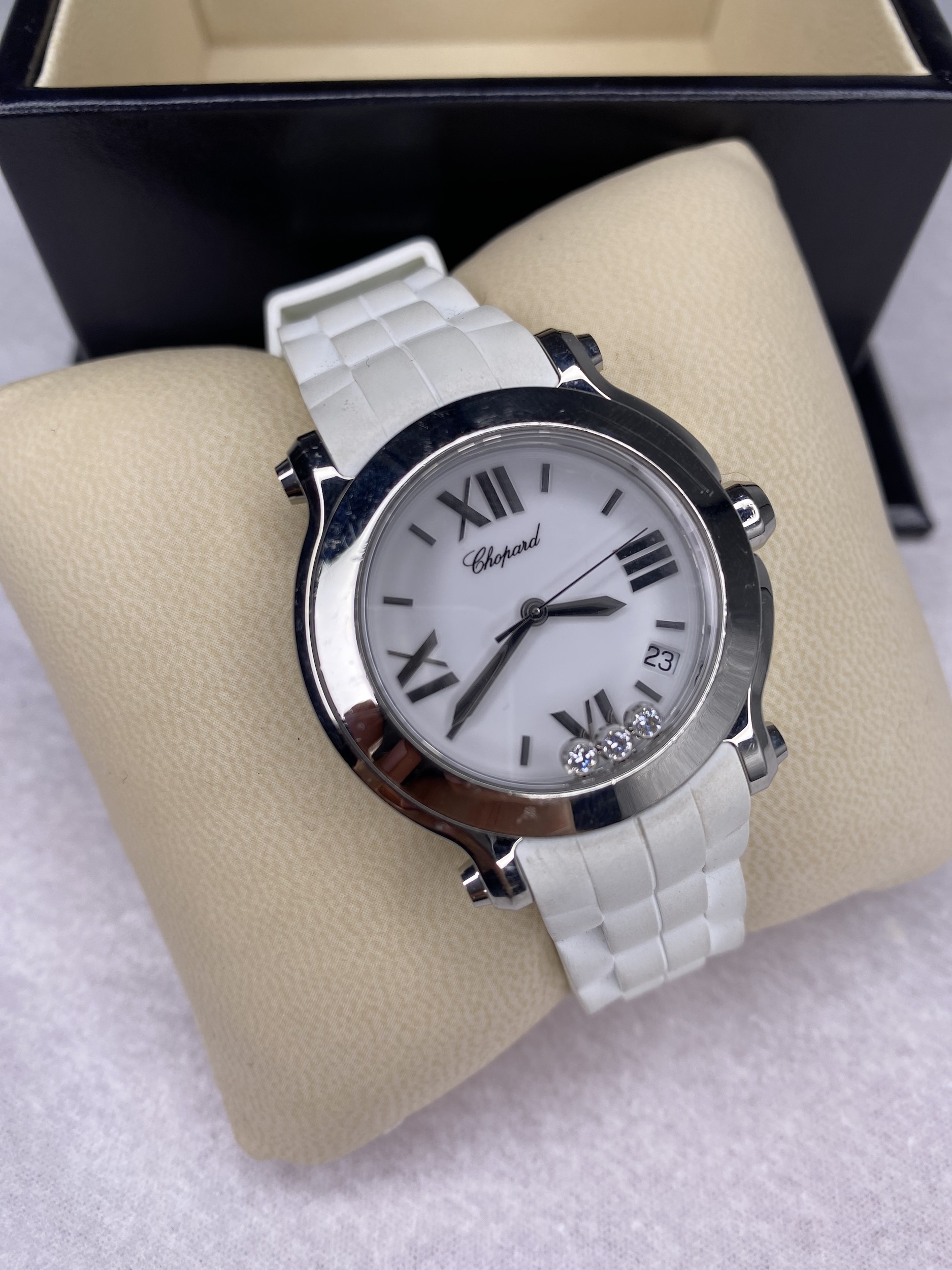 "biały zegarek, model: happy sport stainless steel, 1 szafir 0,17 ct, 3 diamonds 0,15 ct. Dokumenty, certyfikat, pudełko w komplecie."
