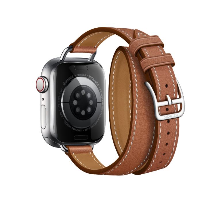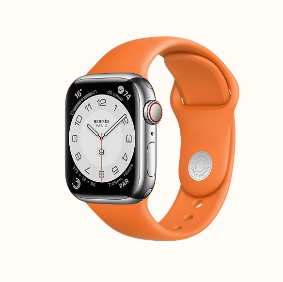 "Boitier series 8 & Bracelet Apple Watch Hermes Double. Brązowa skórzana bransoleta, z białymi przeszyciami. Stan idealny z kompletem pudełek oraz rachunkiem. Ładowarka w komplecie. Dodatkowy gumowy, pomarańczowy pasek, nowy."